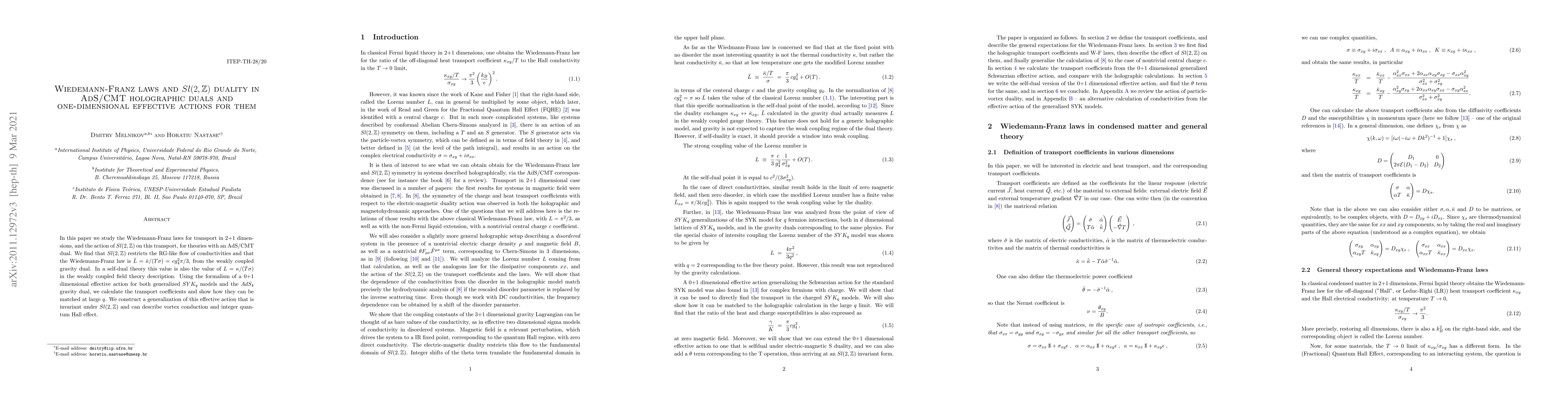 In this paper we study the Wiedemann-Franz laws for transport in 2+1 dimensions, and the action of $Sl(2,\mathbb{Z})$ on this transport, for theories with an AdS/CMT dual. We find that $Sl(2,\mathbb{Z})$ restricts the RG-like flow of conductivities and that the Wiedemann-Franz law is $\bar L =\bar\kappa/(T\sigma)=cg_4^2\pi/3$, from the weakly coupled} gravity dual. In a self-dual theory this value is also the value of $L =\kappa/(T\sigma)$ in the weakly coupled field theory description. Using the formalism of a 0+1 dimensional effective action for both generalized $SYK_q$ models and the $AdS_4$ gravity dual, we calculate the transport coefficients and show how they can be matched at large $q$. We construct a generalization of this effective action that is invariant under $Sl(2,\mathbb{Z})$ and can describe vortex conduction and integer quantum Hall effect.