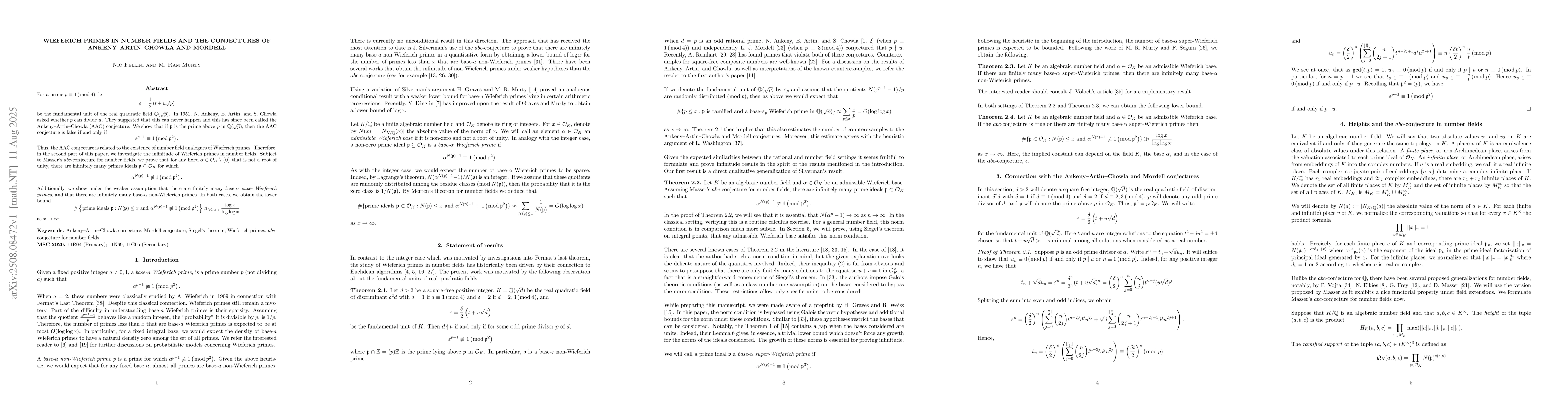 For a prime $p\equiv 1 \,(\bmod{4})$, let \[ \varepsilon = \frac{1}{2}\left( t + u\sqrt{p}\right) \] be the fundamental unit of the real quadratic field $\mathbb{Q}(\sqrt{p})$. In 1951, N. Ankeny, E. Artin, and S. Chowla asked whether $p$ can divide $u$. They suggested that this can never happen and this has since been called the Ankeny--Artin--Chowla (AAC) conjecture. We show that if $\mathfrak{p}$ is the prime above $p$ in $\mathbb{Q}(\sqrt{p})$, then the AAC conjecture is false if and only if \[ \varepsilon^{p-1} \equiv 1\, (\bmod{\mathfrak{p}^2}). \] Thus, the AAC conjecture is related to the existence of number field analogues of Wieferich primes. Therefore, in the second part of this paper, we investigate the infinitude of Wieferich primes in number fields. Subject to Masser's $abc$-conjecture for number fields, we prove that for any fixed $\alpha\in \mathcal{O}_K\setminus\{0\}$ that is not a root of unity, there are infinitely many primes ideals $\mathfrak{p}\subseteq \mathcal{O}_K$ for which \[ \alpha^{N(\mathfrak{p})-1} \not\equiv 1\, (\bmod{\mathfrak{p}^2}). \] Additionally, we show under the weaker assumption that there are finitely many base-$\alpha$ super-Wieferich primes, and that there are infinitely many base-$\alpha$ non-Wieferich primes. In both cases, we obtain the lower bound \[ \#\left\{\text{prime ideals } \mathfrak{p} : N(\mathfrak{p})\leq x \text{ and } \alpha^{N(\mathfrak{p})-1}\not\equiv 1 \,(\bmod{\mathfrak{p}^2})\right\} \gg_{K, \alpha, \varepsilon} \frac{\log x}{\log\log x} \] as $x\to \infty$.