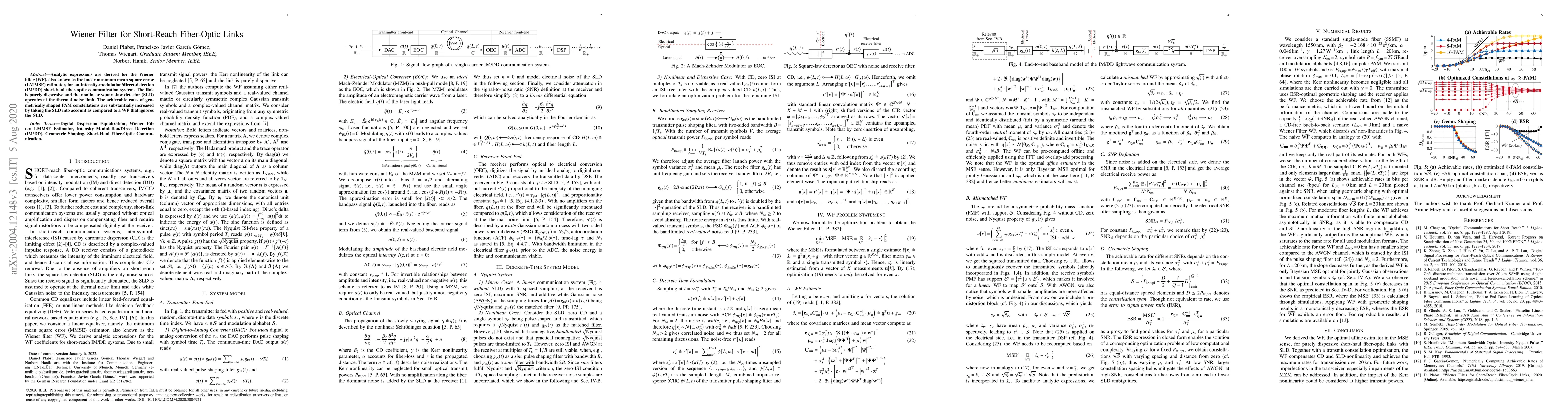 Analytic expressions are derived for the Wiener filter (WF), also known as the linear minimum mean square error (LMMSE) estimator, for an intensity-modulation/direct-detection (IM/DD) short-haul fiber-optic communication system. The link is purely dispersive and the nonlinear square-law detector (SLD) operates at the thermal noise limit. The achievable rates of geometrically shaped PAM constellations are substantially increased by taking the SLD into account as compared to a WF that ignores the SLD.