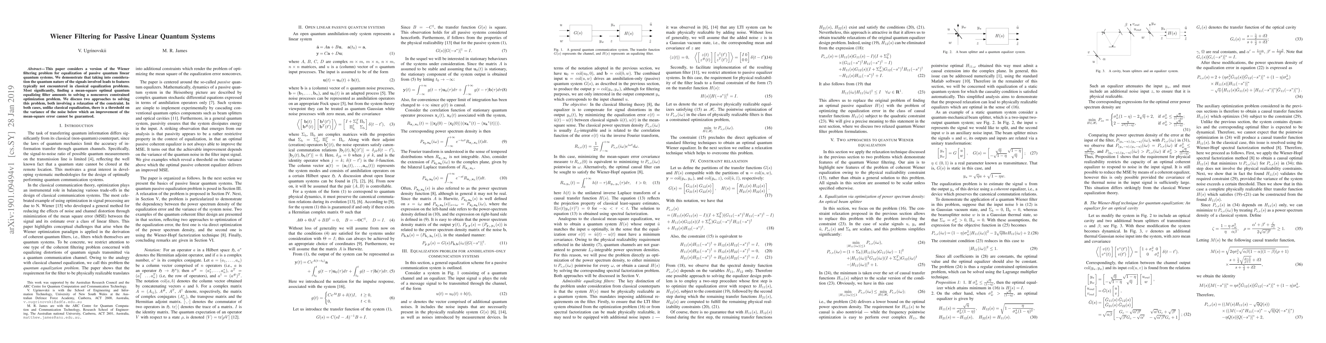 This paper addresses the Wiener filtering problem for passive linear quantum systems, highlighting unique quantum features in signal equalization. It presents a nonconvex optimization problem for optimal filtering and discusses two constraint relaxation methods, revealing a noise variance threshold below which mean-square error improvements are not guaranteed.