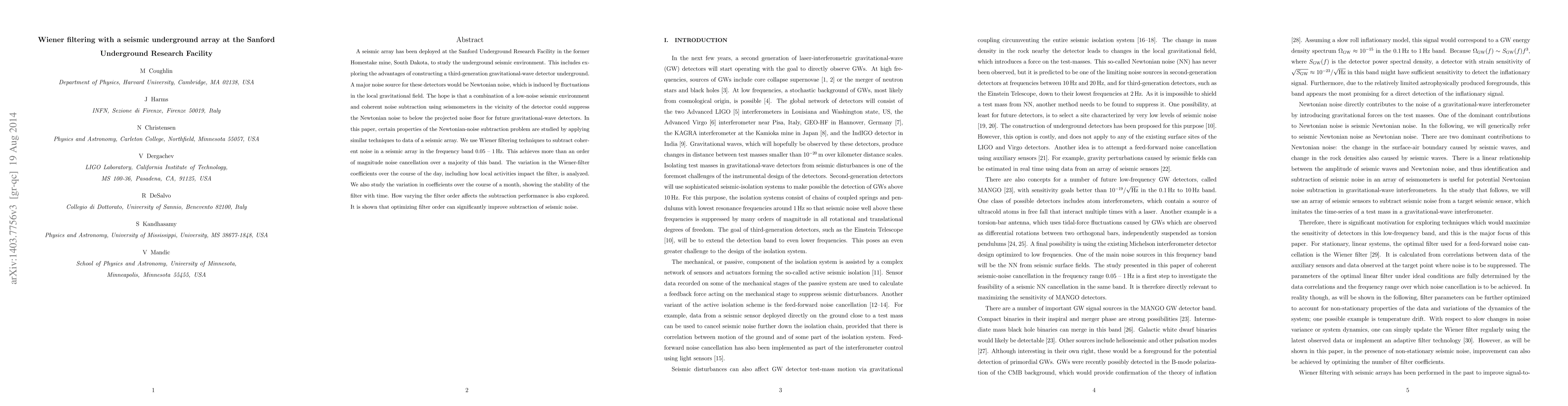 This paper investigates the use of Wiener filtering to reduce coherent noise in a seismic array at the Sanford Underground Research Facility, achieving significant noise cancellation in the 0.05-1 Hz frequency band. The study highlights the potential benefits for future gravitational-wave detectors, emphasizing the stability and optimization of filter coefficients over time and varying filter orders.