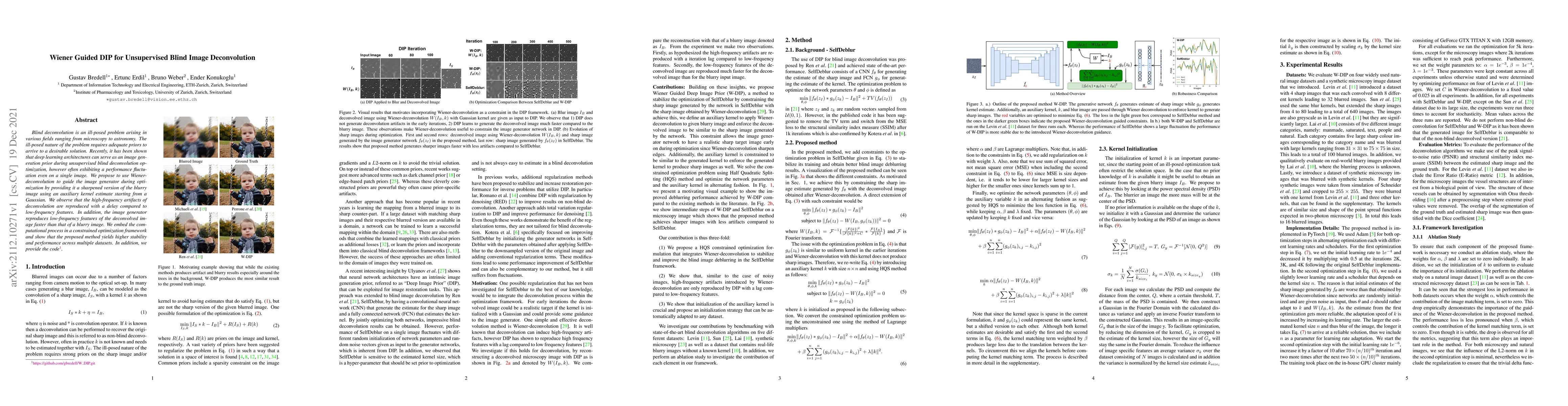 This paper proposes a Wiener-guided deep image prior (DIP) method for unsupervised blind image deconvolution, aiming to stabilize performance by sharpening blurry images using an auxiliary kernel estimate. The method demonstrates higher stability and improved performance across datasets compared to traditional approaches.