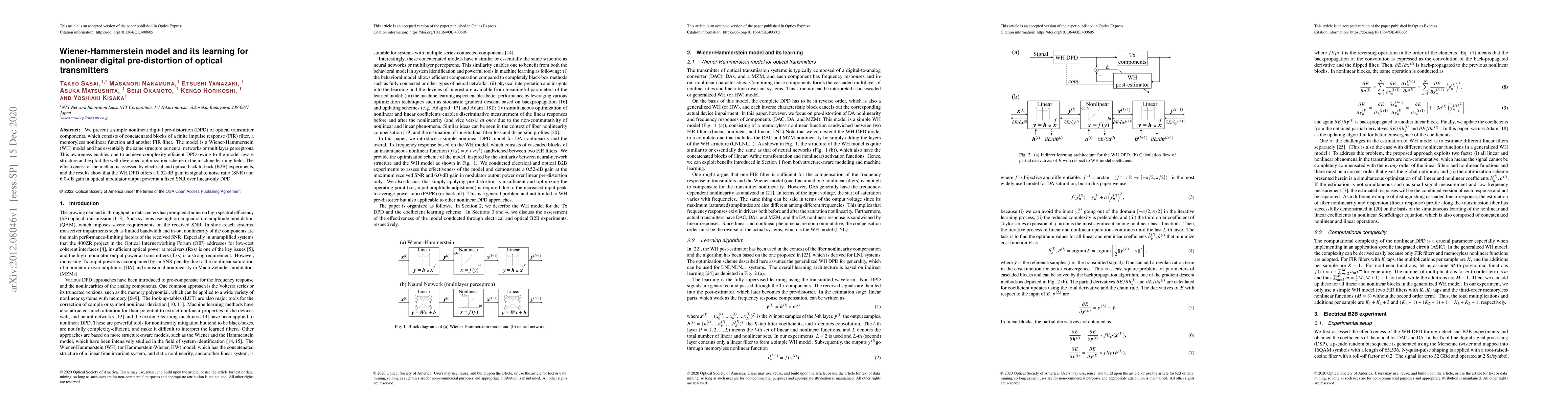 We present a simple nonlinear digital pre-distortion (DPD) of optical transmitter components, which consists of concatenated blocks of a finite impulse response (FIR) filter, a memoryless nonlinear function and another FIR filter. The model is a Wiener-Hammerstein (WH) model and has essentially the same structure as neural networks or multilayer perceptions. This awareness enables one to achieve complexity-efficient DPD owing to the model-aware structure and exploit the well-developed optimization scheme in the machine learning field. The effectiveness of the method is assessed by electrical and optical back-to-back (B2B) experiments, and the results show that the WH DPD offers a 0.52-dB gain in signal-to-noise ratio (SNR) and 6.0-dB gain in optical modulator output power at a fixed SNR over linear-only DPD.