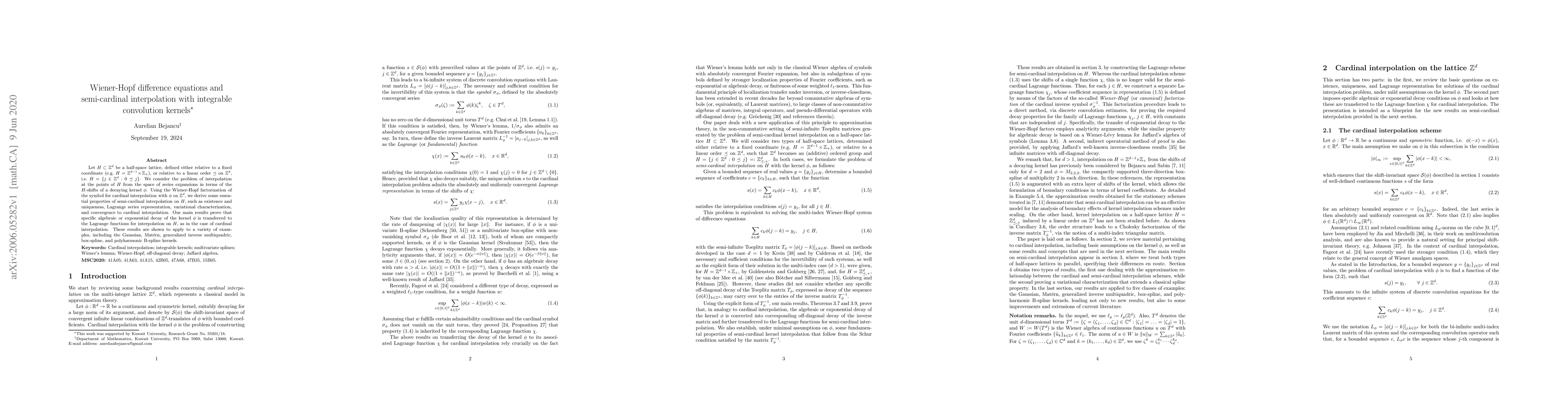 This paper explores Wiener-Hopf difference equations for semi-cardinal interpolation on half-space lattices using integrable convolution kernels. It establishes properties like existence, uniqueness, and convergence for interpolation, showing that decay properties of the kernel transfer to Lagrange functions.