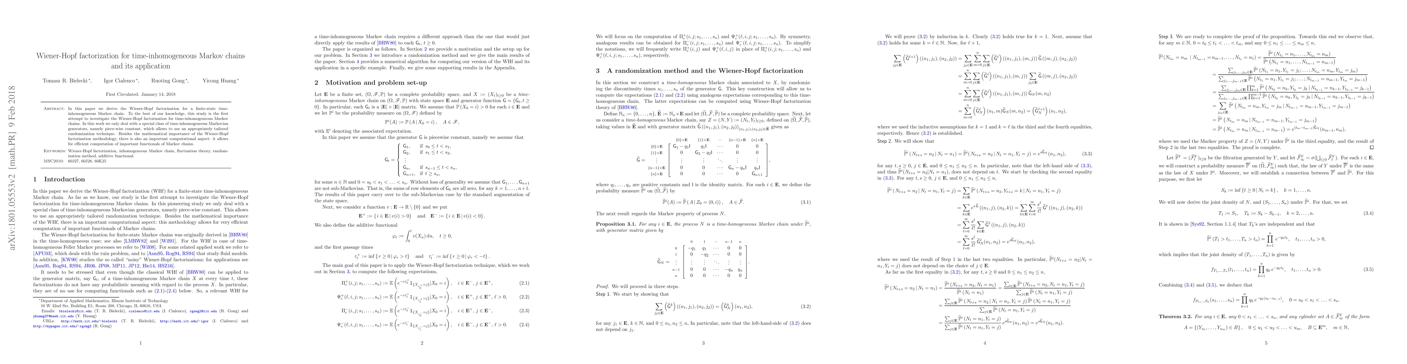 This paper introduces the Wiener-Hopf factorization for finite-state time-inhomogeneous Markov chains, focusing on piece-wise constant generators. This novel approach not only advances mathematical theory but also enhances computational efficiency for key Markov chain functionals.