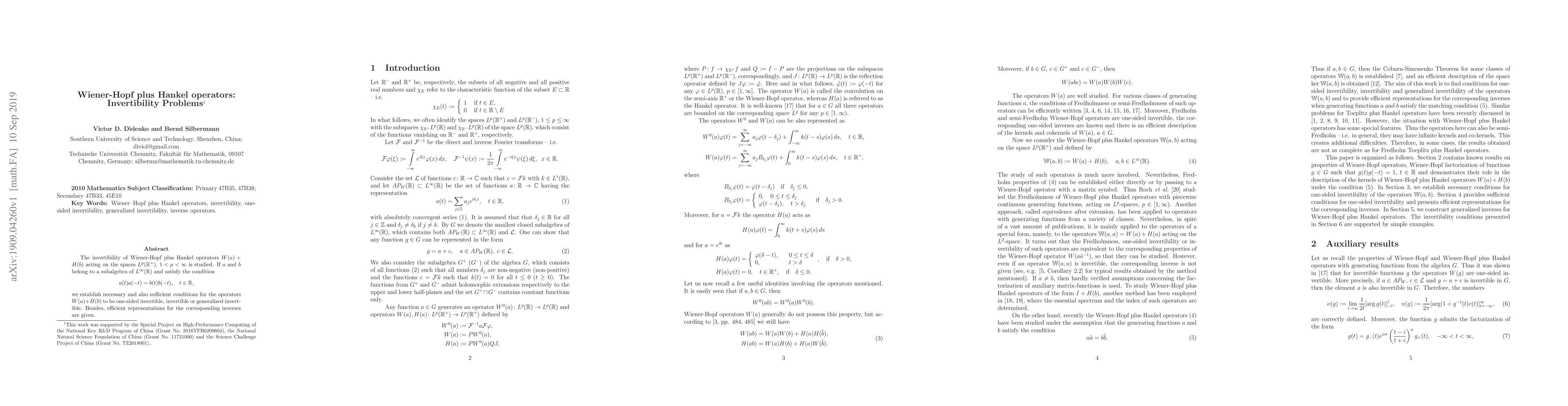 The invertibility of Wiener-Hopf plus Hankel operators $W(a)+H(b)$ acting on the spaces $L^p(\mathbb{R}^+)$, $1 < p<\infty$ is studied. If $a$ and $b$ belong to a subalgebra of $L^\infty(\mathbb{R})$ and satisfy the condition \begin{equation*} a(t) a(-t)=b(t) b(-t),\quad t\in\mathbb{R}, \end{equation*} we establish necessary and also sufficient conditions for the operators $W(a)+H(b)$ to be one-sided invertible, invertible or generalized invertible. Besides, efficient representations for the corresponding inverses are given.