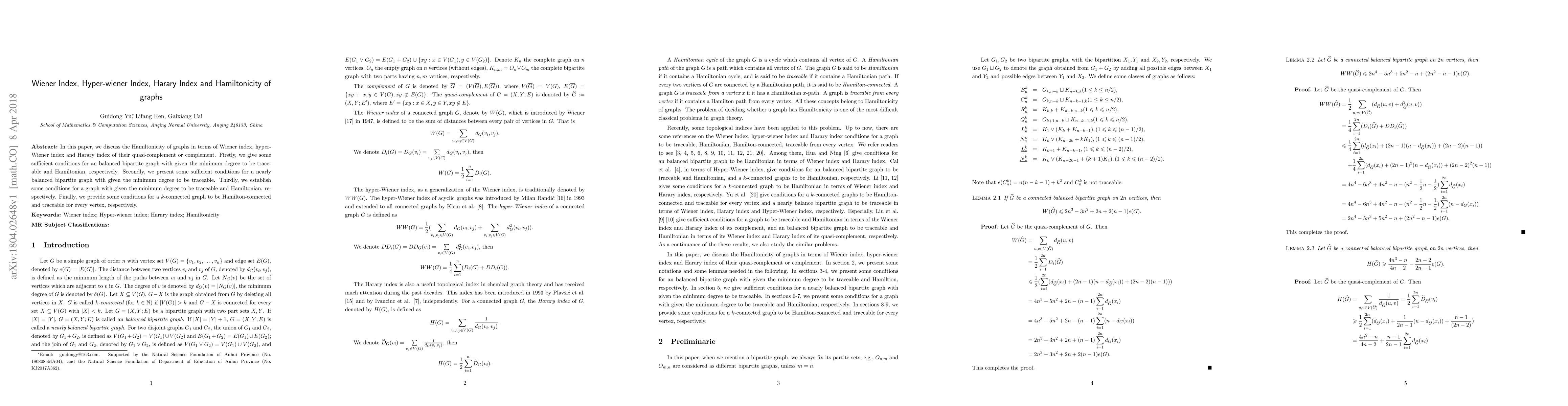 This paper explores the Hamiltonicity of graphs using Wiener index, hyper-Wiener index, and Harary index of their quasi-complement or complement. It provides sufficient conditions for balanced and nearly balanced bipartite graphs to be traceable and Hamiltonian based on minimum degree.