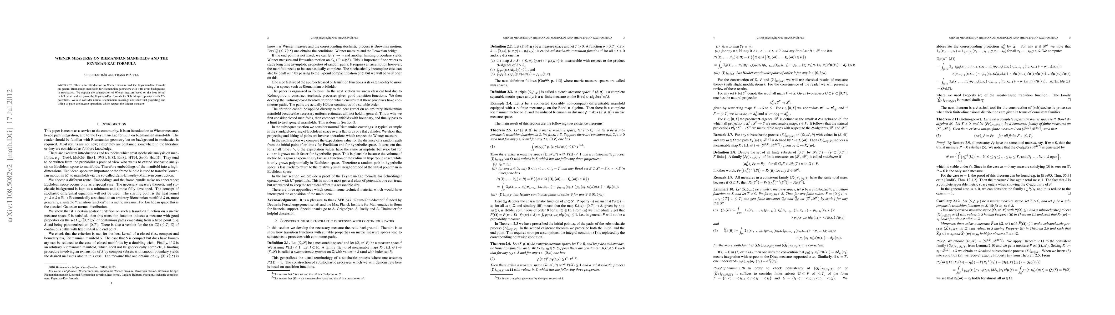 This paper introduces Wiener measure and the Feynman-Kac formula on Riemannian manifolds, detailing the construction based on the heat kernel and proving the Feynman-Kac formula for Schrödinger operators. It also explores how projecting and lifting paths respect Wiener measure in normal Riemannian coverings.
