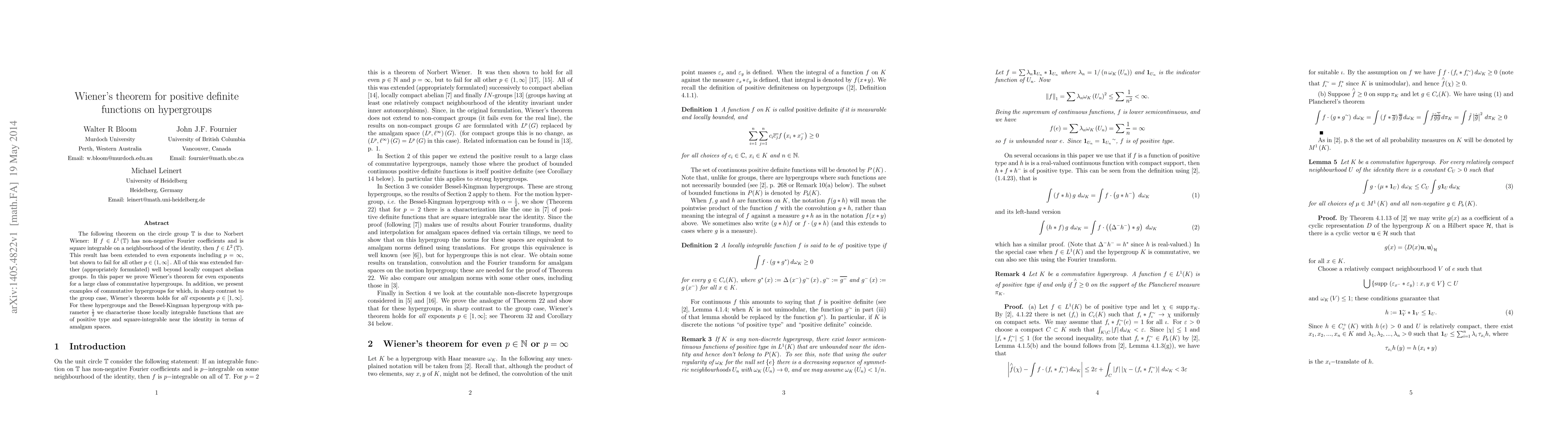 This paper extends Wiener's theorem for positive definite functions on commutative hypergroups, proving it for even exponents and identifying hypergroups where it holds for all exponents. It also characterizes positive type and square-integrable functions using amalgam spaces.