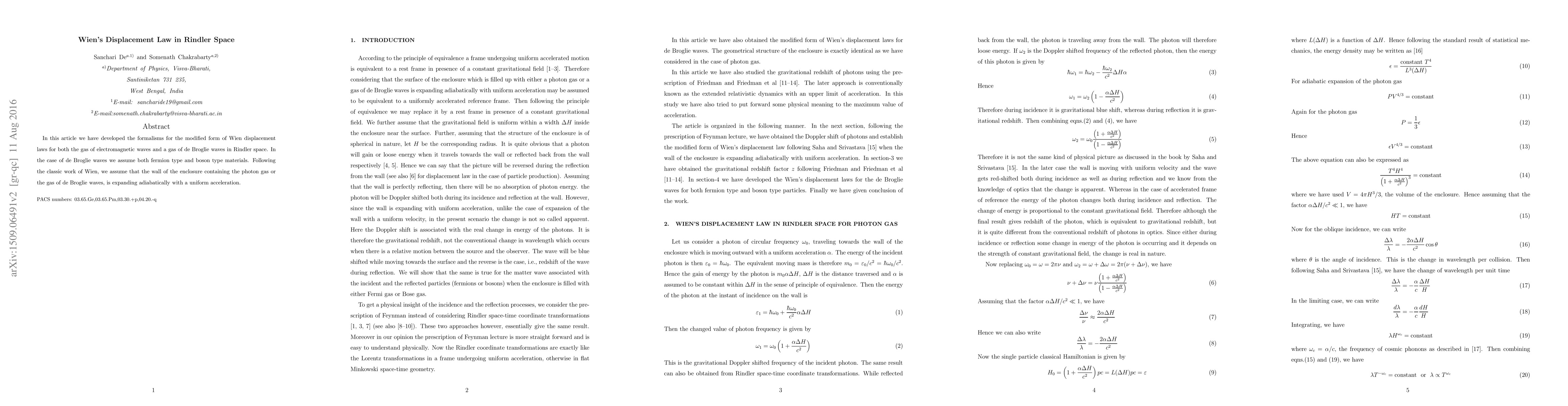 This paper develops modified Wien displacement laws for electromagnetic and de Broglie waves in Rindler space, considering both fermion and boson types, under the assumption of an adiabatically expanding enclosure with uniform acceleration.