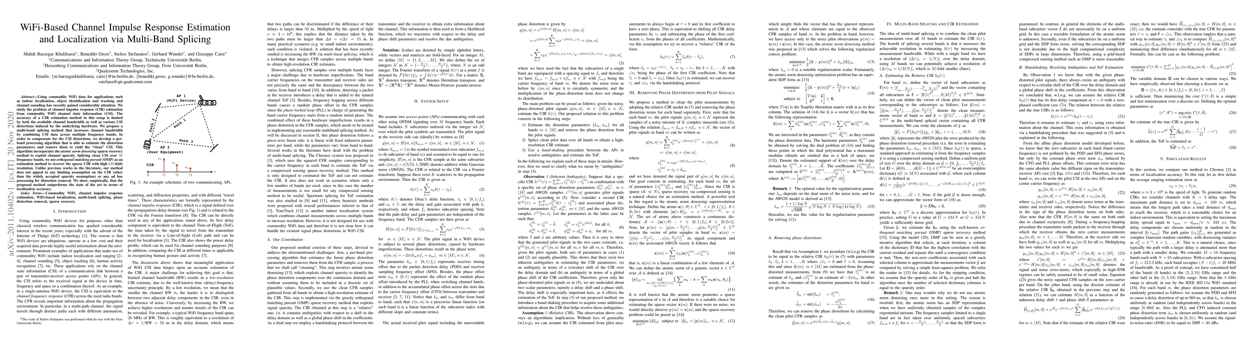 This paper proposes a multi-band splicing method for estimating channel impulse response (CIR) from WiFi channel state information (CSI), addressing bandwidth and hardware distortion issues. It uses a per-band processing algorithm to remove distortions and employs orthogonal matching pursuit for high-resolution CIR recovery, outperforming existing methods in localization accuracy.