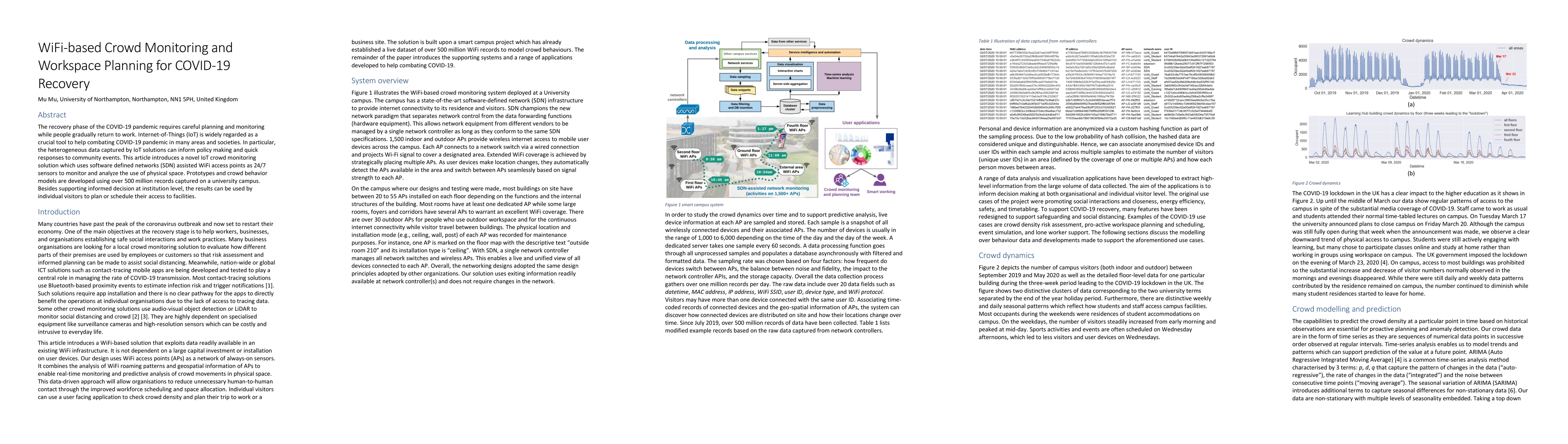 The recovery phase of the COVID-19 pandemic requires careful planning and monitoring while people gradually return to work. Internet-of-Things (IoT) is widely regarded as a crucial tool to help combating COVID-19 pandemic in many areas and societies. In particular, the heterogeneous data captured by IoT solutions can inform policy making and quick responses to community events. This article introduces a novel IoT crowd monitoring solution which uses software defined networks (SDN) assisted WiFi access points as 24/7 sensors to monitor and analyze the use of physical space. Prototypes and crowd behavior models are developed using over 500 million records captured on a university campus. Besides supporting informed decision at institution level, the results can be used by individual visitors to plan or schedule their access to facilities.
