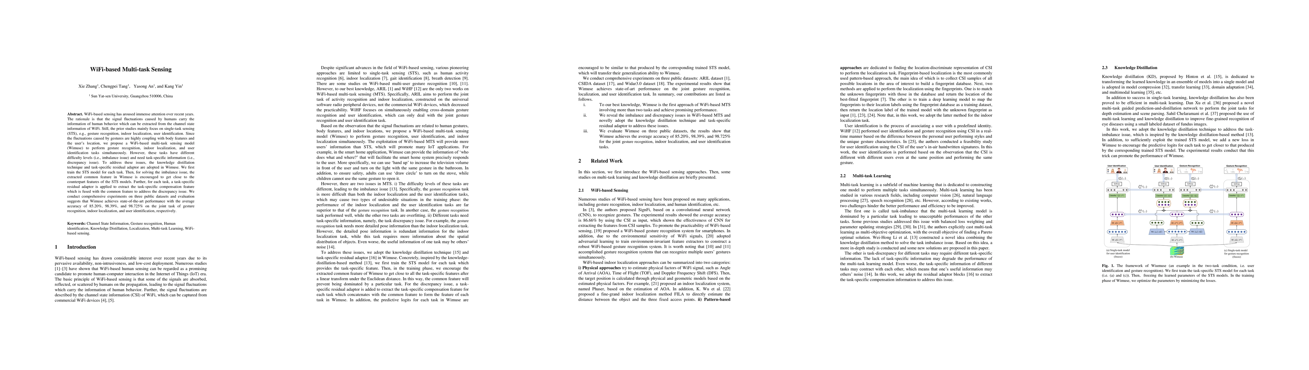 This paper proposes Wimuse, a WiFi-based multi-task sensing model that simultaneously performs gesture recognition, indoor localization, and user identification. It addresses the imbalance and discrepancy issues among tasks using knowledge distillation and task-specific residual adaptors, achieving state-of-the-art performance with high accuracy on public datasets.