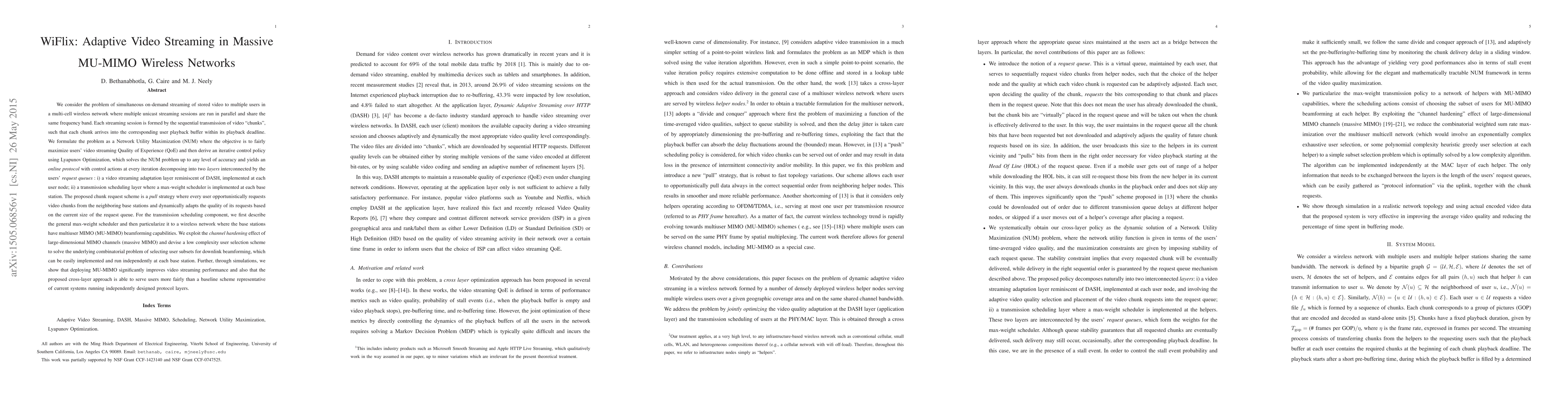 WiFlix proposes an adaptive video streaming method for massive MU-MIMO wireless networks, optimizing user experience through Network Utility Maximization and Lyapunov Optimization. It employs a dual-layer protocol combining DASH-like streaming adaptation and a max-weight scheduler for efficient transmission scheduling in multiuser MIMO environments.
