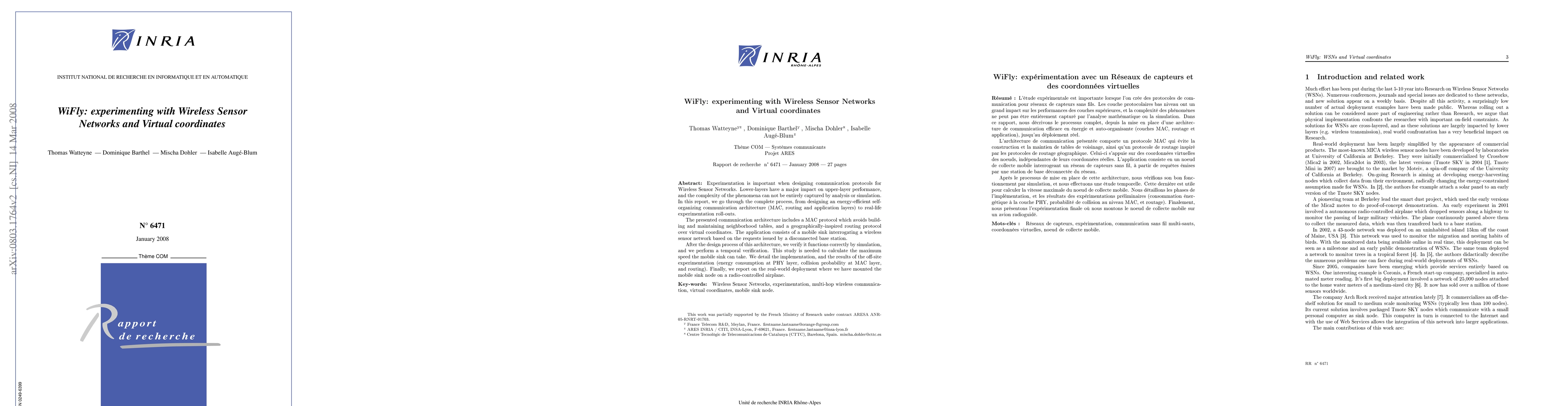 Experimentation is important when designing communication protocols for Wireless Sensor Networks. Lower-layers have a major impact on upper-layer performance, and the complexity of the phenomena can not be entirely captured by analysis or simulation. In this report, we go through the complete process, from designing an energy-efficient self-organizing communication architecture (MAC, routing and application layers) to real-life experimentation roll-outs. The presented communication architecture includes a MAC protocol which avoids building and maintaining neighborhood tables, and a geographically-inspired routing protocol over virtual coordinates. The application consists of a mobile sink interrogating a wireless sensor network based on the requests issued by a disconnected base station. After the design process of this architecture, we verify it functions correctly by simulation, and we perform a temporal verification. This study is needed to calculate the maximum speed the mobile sink can take. We detail the implementation, and the results of the off-site experimentation (energy consumption at PHY layer, collision probability at MAC layer, and routing). Finally, we report on the real-world deployment where we have mounted the mobile sink node on a radio-controlled airplane.
