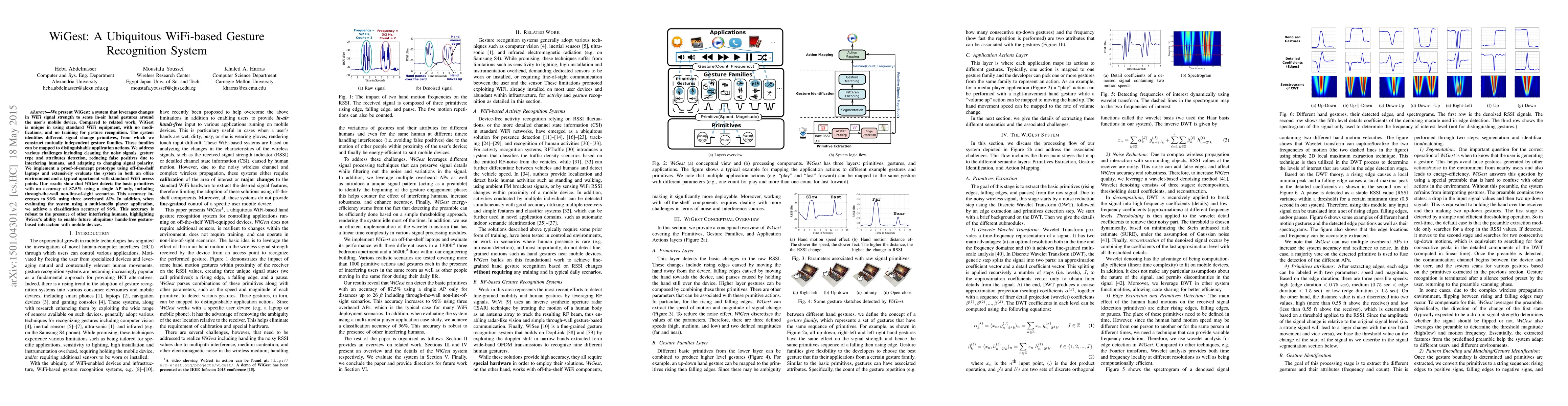WiGest is a WiFi-based gesture recognition system that uses standard WiFi equipment to detect in-air hand gestures without modifications or training. It achieves high accuracy in gesture detection, up to 96%, even in non-line-of-sight scenarios, demonstrating potential for ubiquitous hands-free interaction with mobile devices.