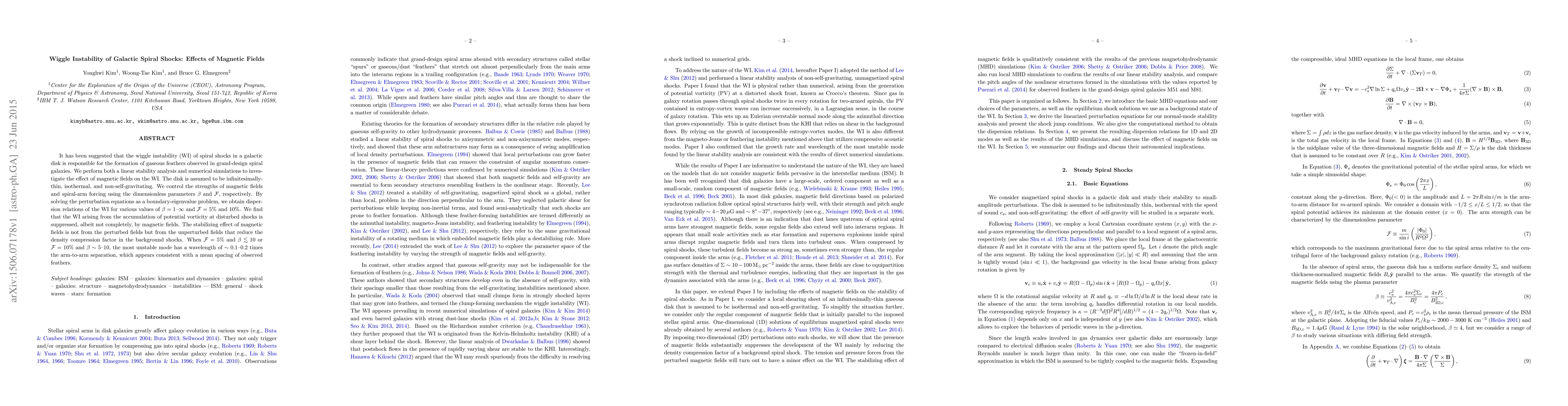 This paper investigates the wiggle instability of spiral shocks in galactic disks, focusing on the influence of magnetic fields. It finds that magnetic fields suppress the instability, primarily through unperturbed fields that reduce shock compression, leading to a wavelength of observed gaseous feathers consistent with observations.
