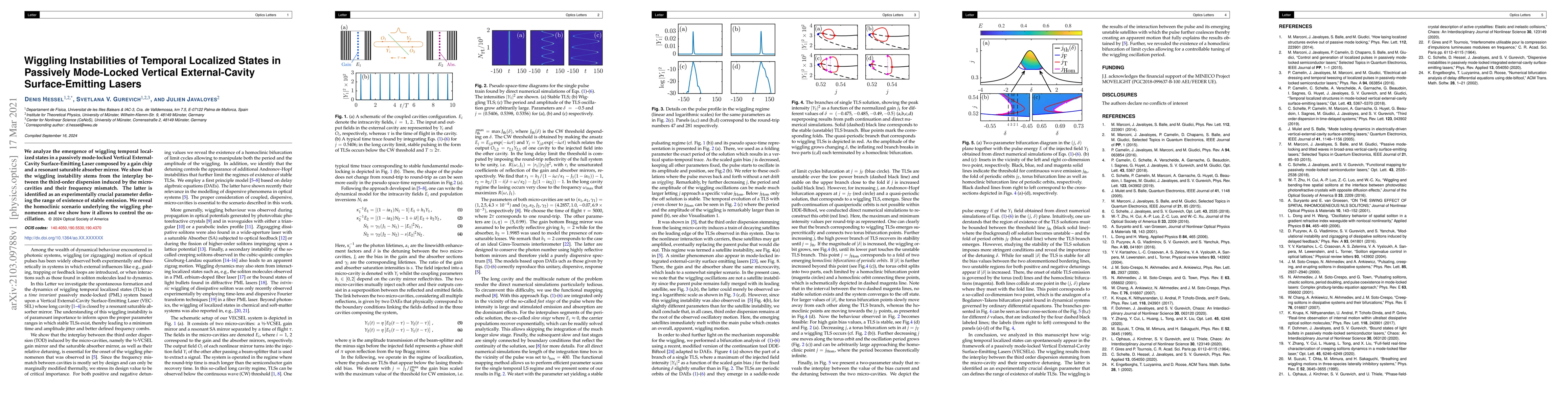 This paper investigates the emergence of wiggling temporal localized states in passively mode-locked vertical external-cavity surface-emitting lasers, attributing the instability to the interplay between third-order dispersion and frequency mismatch. The study reveals a homoclinic scenario that enables control over the oscillation dynamics.