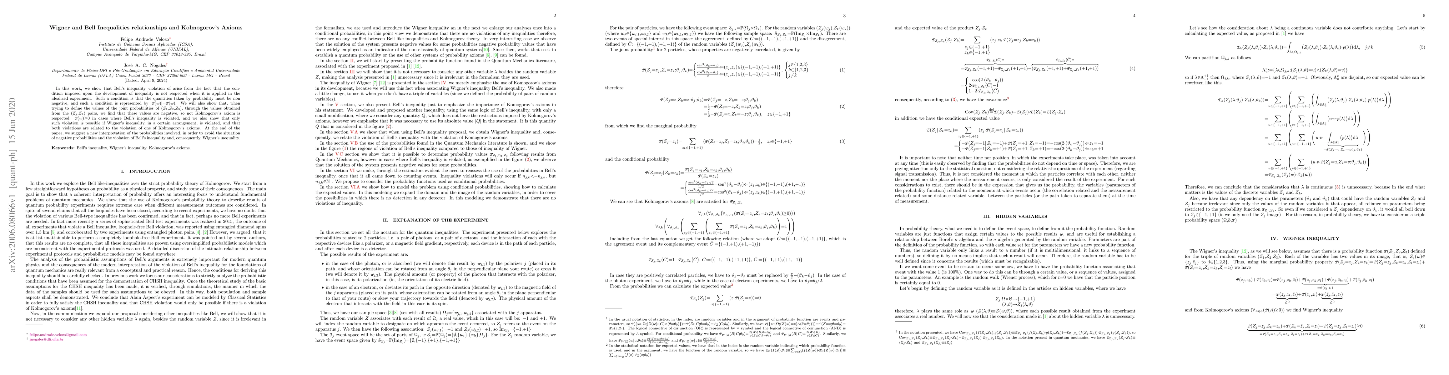 In this work, we show that Bell's inequality violation of arise from the fact that the condition imposed upon the development of inequality is not respected when it is applied in the idealized experiment. Such a condition is that the quantities taken by probability must be non negative, and such a condition is represented by $|\cal{P(w)}|=\cal{P(w)}$. We will also show that, when trying to define the values of the joint probabilities of $ (Z_1, Z_2, Z_3) $, through the values obtained from the $ (Z_j, Z_k) $ pairs, we find that these values are negative, so not Kolmogorov's axiom is respected: $\cal{P(w)}\geq0$ in cases where Bell's inequality is violated, and we also show that only such violation is possible if Wigner's inequality, in a certain arrangement, is violated, and that both violations are related to the violation of one of Kolmogorov's axioms. At the end of the paper, we suggest a new interpretation of the probabilities involved, in order to avoid the situation of negative probabilities and the violation of Bell's inequality and, consequently, Wigner's inequality.