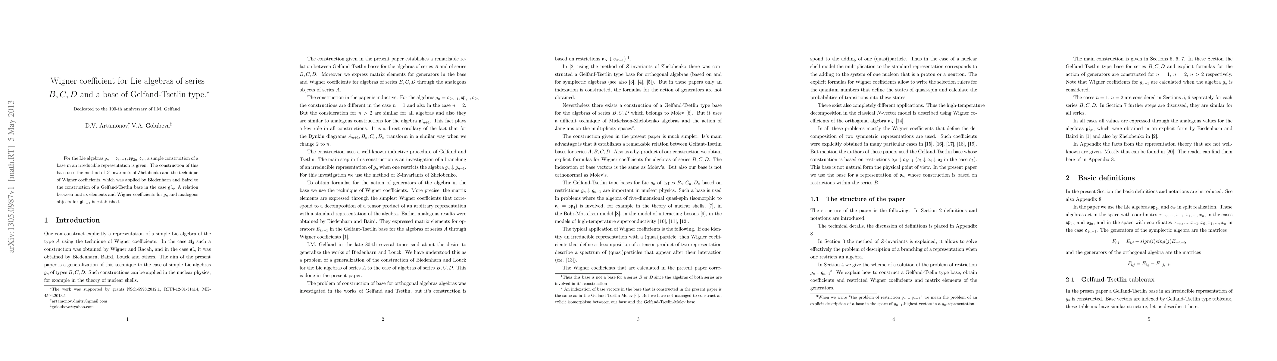 For the Lie algebras $g_n= \mathfrak{o}_{2n+1},\mathfrak{sp}_{2n},\mathfrak{o}_{2n}$ a simple construction of a base in an irreducible representation is given. The construction of this base uses the method of $Z$-invariants of Zhelobenko and the technique of Wigner coefficients, which was applied by Biedenharn and Baird to the construction of a Gelfand-Tsetlin base in the case $\mathfrak{gl}_n$. A relation between matrix elements and Wigner coefficients for $g_n$ and analogous objects for $\mathfrak{gl}_{n+1}$ is established.