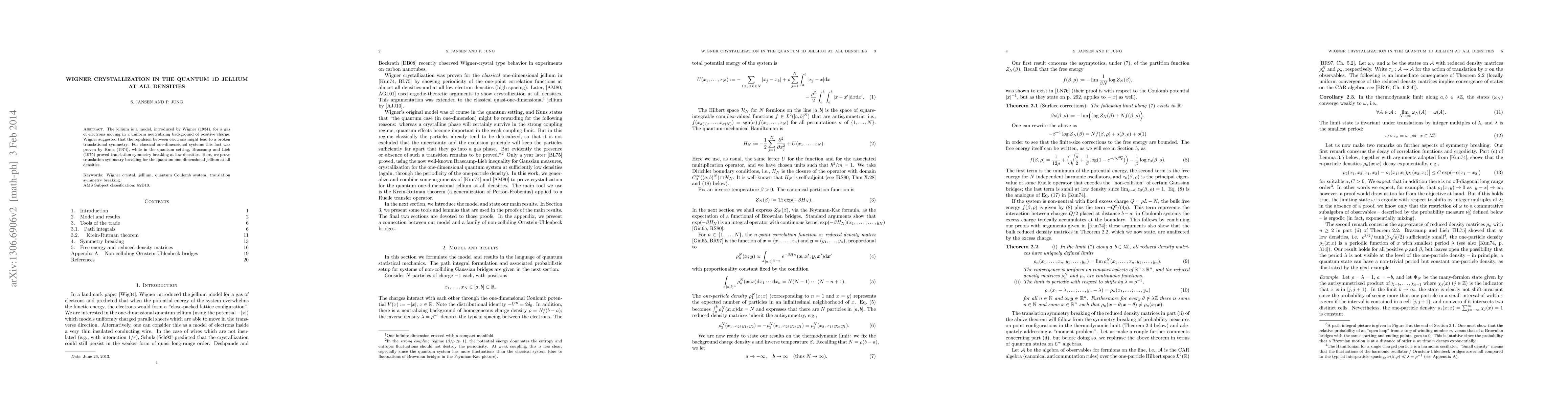 This paper proves that Wigner crystallization, characterized by broken translational symmetry, occurs in the quantum one-dimensional jellium model at all densities, extending previous results that only covered low densities.