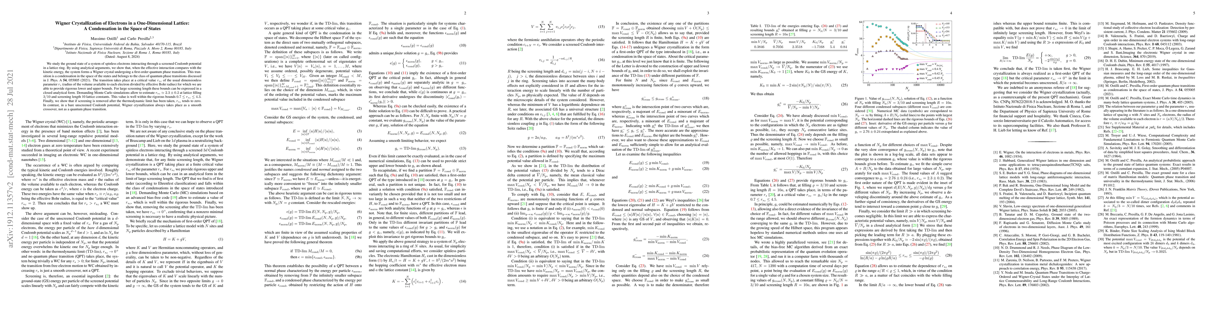 This paper investigates the ground state of spinless electrons in a one-dimensional lattice, demonstrating that under certain conditions, they undergo a first-order quantum phase transition to form a Wigner crystal. The transition occurs at a critical value of the parameter $r_s$, with rigorous bounds and Monte Carlo estimates confirming the phenomenon.