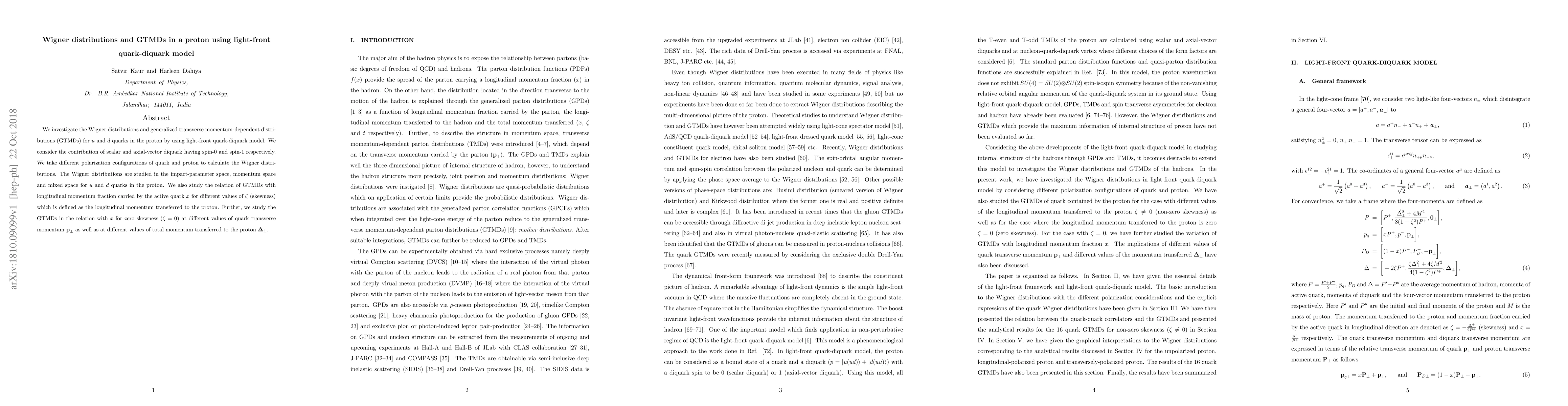 This paper explores Wigner distributions and generalized transverse momentum-dependent distributions (GTMDs) for $u$ and $d$ quarks in a proton using a light-front quark-diquark model, considering both scalar and axial-vector diquark contributions. The study examines these distributions in impact-parameter, momentum, and mixed spaces, and analyzes the relationship between GTMDs and the longitudinal momentum fraction $x$ for various skewness values.