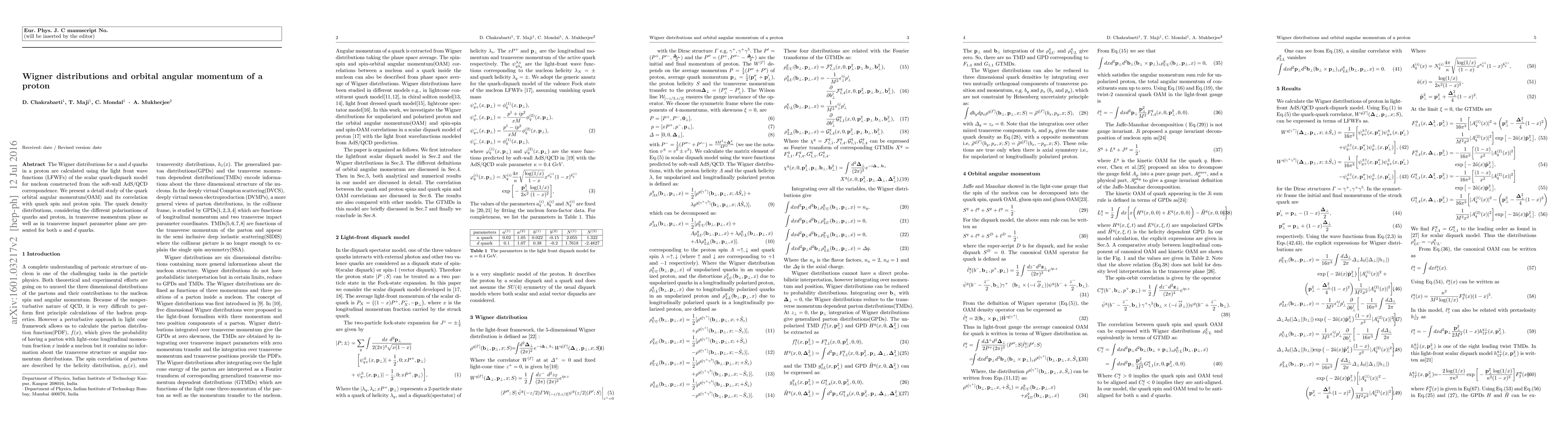 This paper calculates Wigner distributions for u and d quarks in a proton using light front wave functions from the soft-wall AdS/QCD model, focusing on the orbital angular momentum of quarks and its correlation with quark spin and proton spin. It also presents quark density distributions in various planes for different quark and proton polarizations.