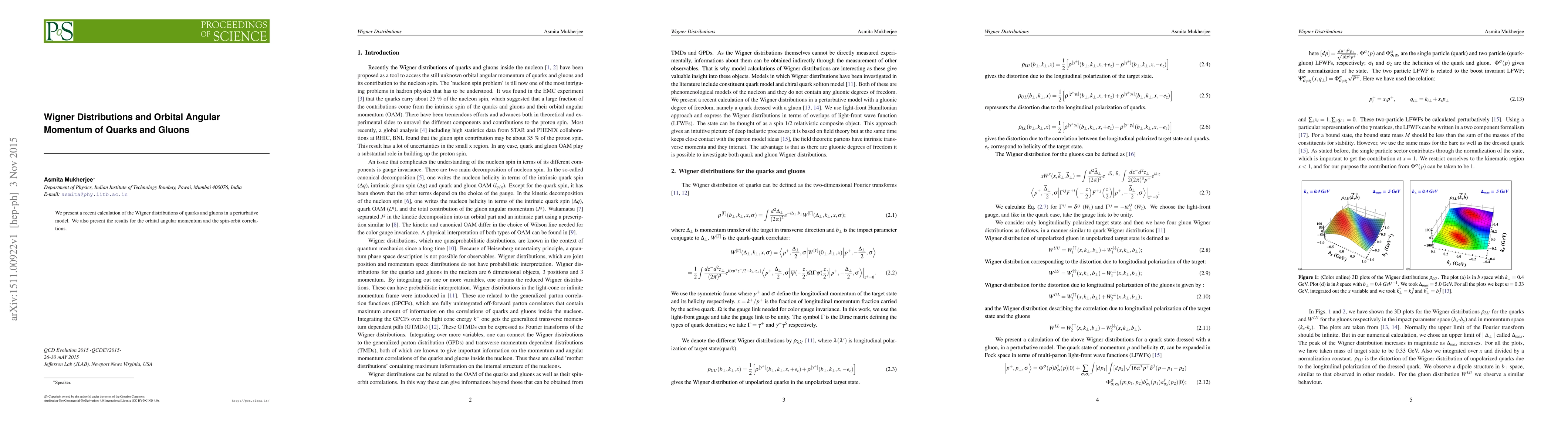 The research presents a recent calculation of Wigner distributions for quarks and gluons in a perturbative model using light-front Hamiltonian approach, expressing them in terms of overlaps of light-front wave functions (LFWFs).