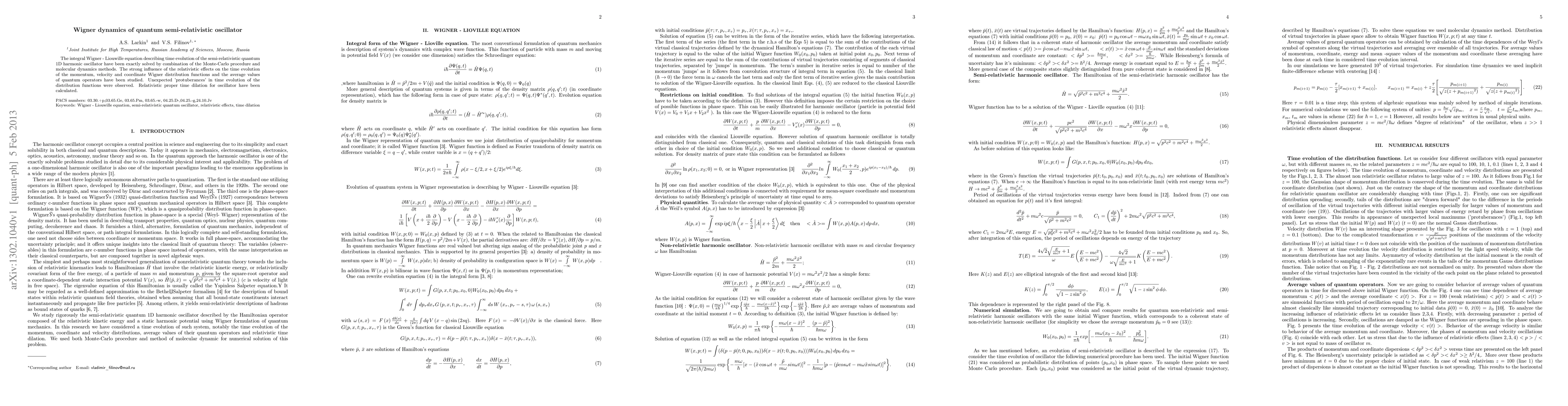 This paper presents an exact solution to the Wigner-Liouwille equation for a semi-relativistic quantum harmonic oscillator, employing Monte-Carlo and molecular dynamics methods. It reveals significant relativistic effects on the time evolution of momentum, velocity, and coordinate distributions, alongside unexpected 'protuberances' and the calculation of relativistic proper time dilation for the oscillator.