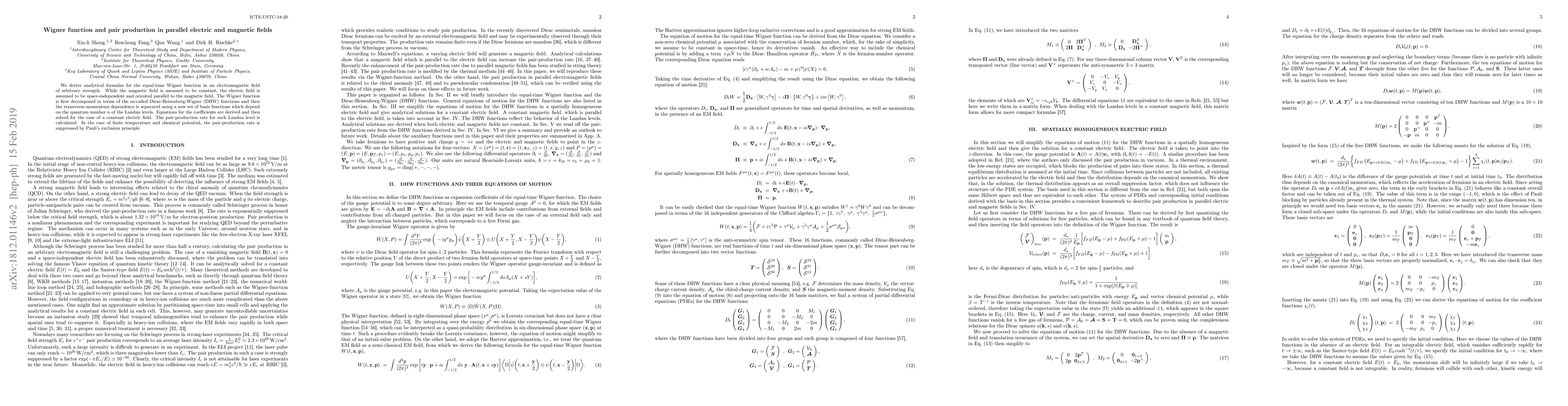 Researchers derived analytical formulas for the Wigner function in an electromagnetic field with parallel electric and magnetic fields, calculating pair-production rates for each Landau level, which are suppressed at finite temperature and chemical potential.