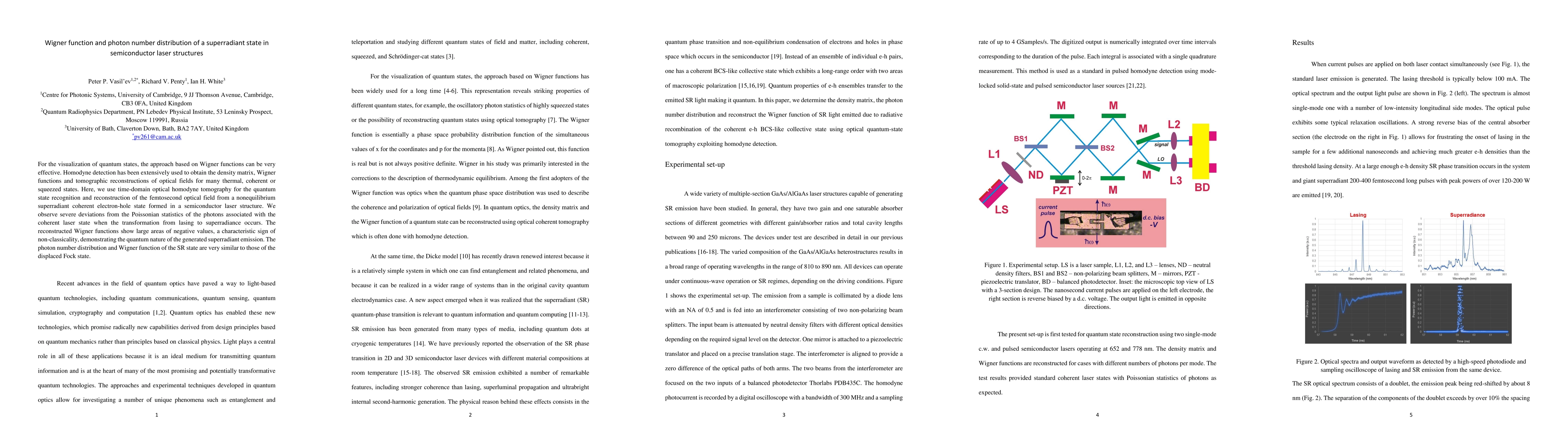 For the visualization of quantum states, the approach based on Wigner functions can be very effective. Homodyne detection has been extensively used to obtain the density matrix, Wigner functions and tomographic reconstructions of optical fields for many thermal, coherent or squeezed states. Here, we use time-domain optical homodyne tomography for the quantum state recognition and reconstruction of the femtosecond optical field from a nonequilibrium superradiant coherent electron-hole state formed in a semiconductor laser structure. We observe severe deviations from the Poissonian statistics of the photons associated with the coherent laser state when the transformation from lasing to superradiance occurs. The reconstructed Wigner functions show large areas of negative values, a characteristic sign of non-classicality, demonstrating the quantum nature of the generated superradiant emission. The photon number distribution and Wigner function of the SR state are very similar to those of the displaced Fock state