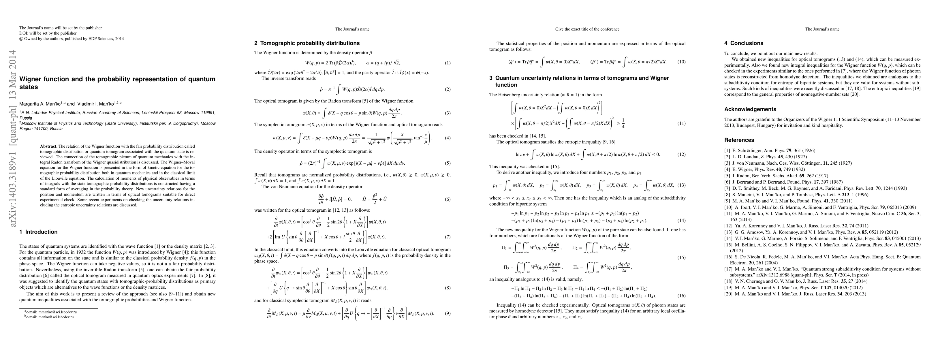 This paper reviews the Wigner function's relation to the tomographic distribution, exploring its connection to quantum mechanics and classical limits via the Radon transform. It also presents the Wigner-Moyal equation and discusses new uncertainty relations, alongside recent experimental validations.