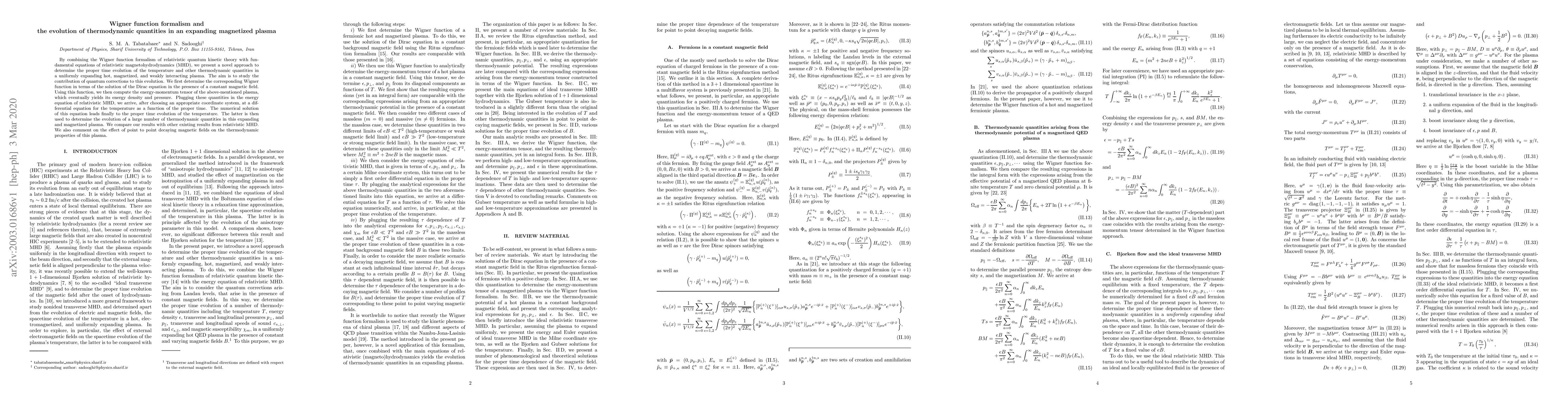 By combining the Wigner function formalism of relativistic quantum kinetic theory with fundamental equations of relativistic magnetohydrodynamics (MHD), we present a novel approach to determine the proper time evolution of the temperature and other thermodynamic quantities in a uniformly expanding hot, magnetized, and weakly interacting plasma. The aim is to study the contribution of quantum corrections to this evolution. We first determine the corresponding Wigner function in terms of the solution of the Dirac equation in the presence of a constant magnetic field. Using this function, we then compute the energy-momentum tensor of the above-mentioned plasma, which eventually yields its energy density and pressure. Plugging these quantities in the energy equation of relativistic MHD, we arrive, after choosing an appropriate coordinate system, at a differential equation for the temperature as a function of the proper time. The numerical solution of this equation leads finally to the proper time evolution of the temperature. The latter is then used to determine the evolution of a large number of thermodynamic quantities in this expanding and magnetized plasma. We compare our results with other existing results from relativistic MHD. We also comment on the effect of point to point decaying magnetic fields on the thermodynamic properties of this plasma.