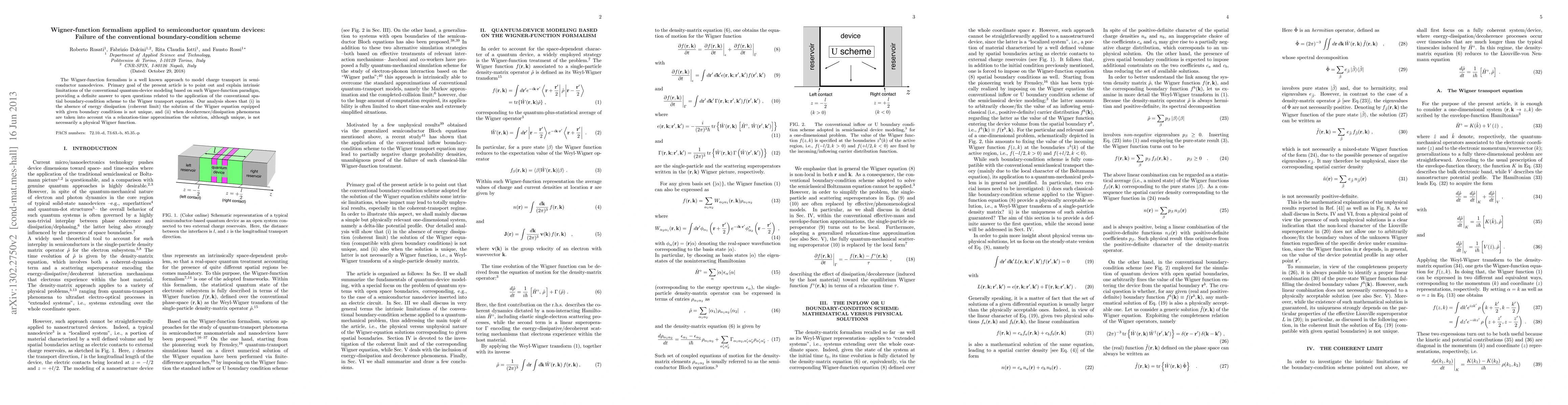 The Wigner-function formalism is a well known approach to model charge transport in semiconductor nanodevices. Primary goal of the present article is to point out and explain intrinsic limitations of the conventional quantum-device modeling based on such Wigner-function paradigm, providing a definite answer to open questions related to the application of the conventional spatial boundary-condition scheme to the Wigner transport equation. Our analysis shows that (i) in the absence of energy dissipation (coherent limit) the solution of the Wigner equation equipped with given boundary conditions is not unique, and (ii) when decoherence/dissipation phenomena are taken into account via a relaxation-time approximation the solution, although unique, is not necessarily a physical Wigner function.