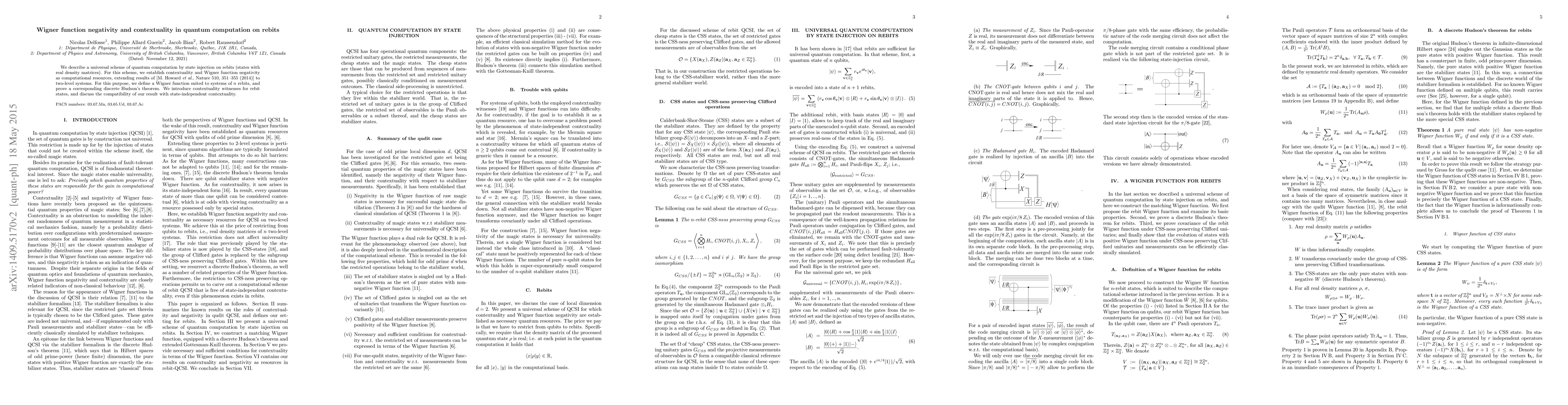 This paper introduces a universal quantum computation scheme for rebits utilizing state injection and demonstrates that contextuality and Wigner function negativity are computational resources. It extends previous contextuality results to two-level systems and includes a discrete Hudson's theorem for $n$ rebits, along with contextuality witnesses for rebit states.