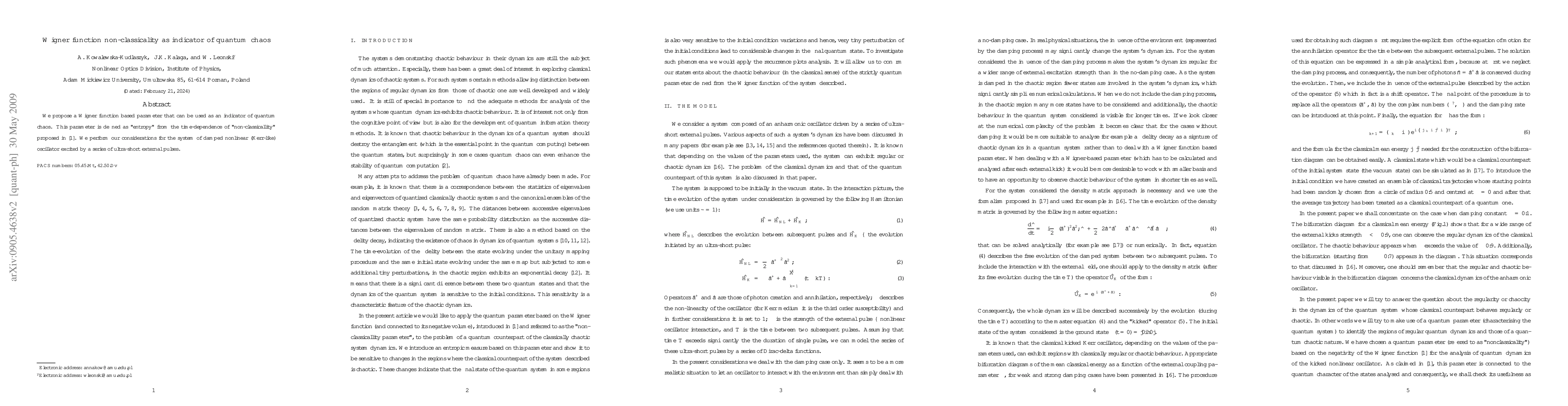 We propose a Wigner function based parameter that can be used as an indicator of quantum chaos. This parameter is defined as "entropy" from the time-dependence of "non-classicallity" proposed in \cite{KZ04}. We perform our considerations for the system of damped nonlinear (Kerr-like) oscillator excited by a series of ultra-short external pulses.