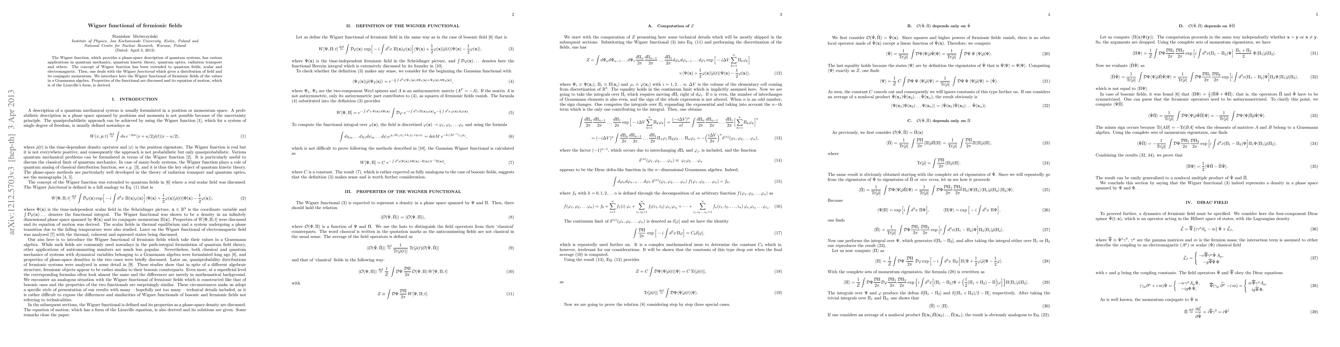This paper introduces the Wigner functional for fermionic fields, extending the Wigner function concept to quantum fields within a Grassmann algebra. It discusses properties of the functional and derives its equation of motion in the form of a Liouville equation.