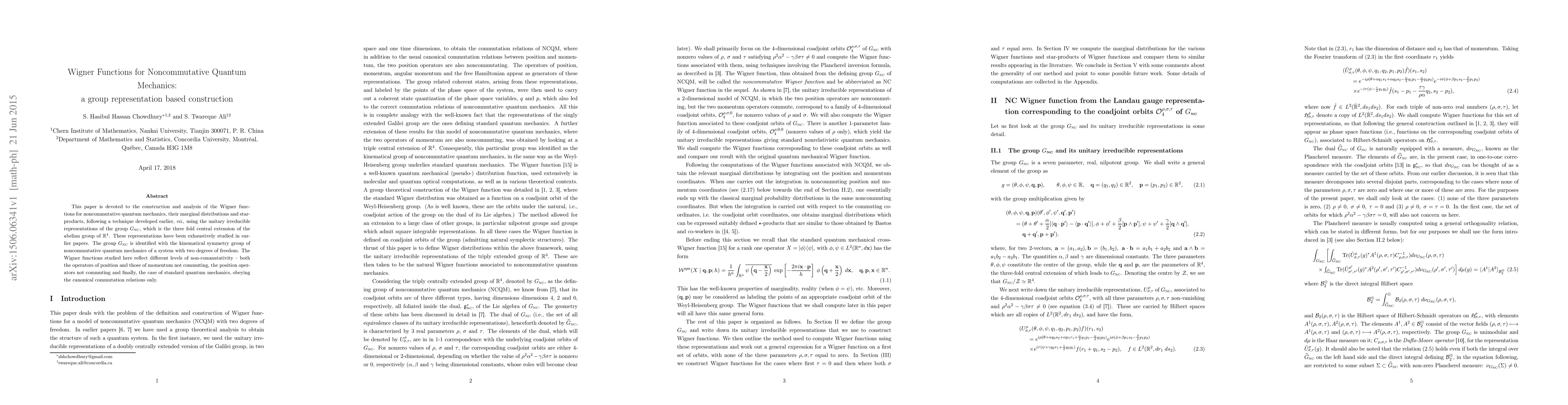 This paper constructs Wigner functions for noncommutative quantum mechanics using group representation techniques, focusing on the kinematical symmetry group $\g$ of a system with two degrees of freedom. It explores various levels of non-commutativity, from full operator non-commutation to standard quantum mechanics.