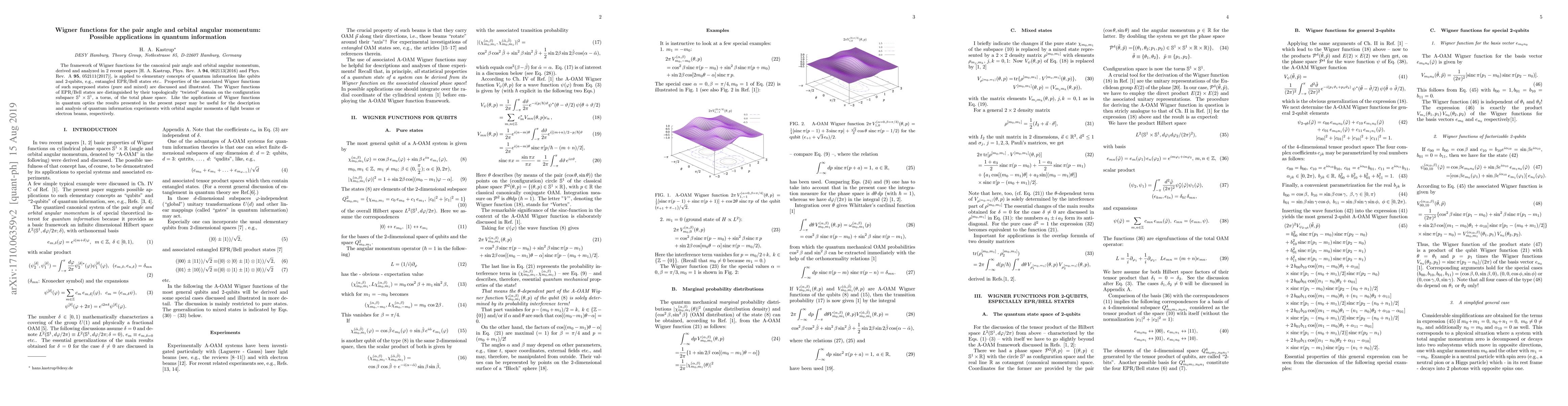 The framework of Wigner functions for the canonical pair angle and orbital angular momentum, derived and analyzed in 2 recent papers [H. A. Kastrup, Phys.Rev. A 94, 062113(2016) and Phys.Rev. A 95, 052111(2017)] is applied to elementary concepts of quantum information like qubits and 2-qubits, e.g., entangled EPR/Bell states etc. Properties of the associated Wigner functions of such superposed states (pure and mixed) are discussed and illustrated. The Wigner functions of ERP/Bell states are distinguished by their topologically "twisted" domain on the configuration subspace S^1xS^1, a torus, of the total phase space. Like the applications of Wigner functions in quantum optics the results presented in the present paper may be useful for the description and analysis of quantum information experiments with orbital angular momenta of light beams or electron beams, respectively.