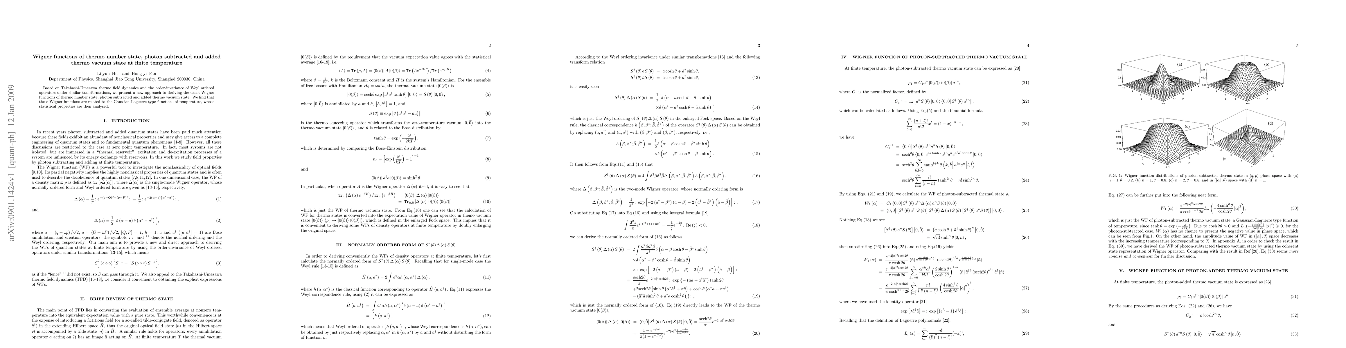 Based on Takahashi-Umezawa thermo field dynamics and the order-invariance of Weyl ordered operators under similar transformations, we present a new approach to deriving the exact Wigner functions of thermo number state, photon subtracted and added thermo vacuum state. We find that these Wigner functions are related to the Gaussian-Laguerre type functions of temperature, whose statistical properties are then analysed.