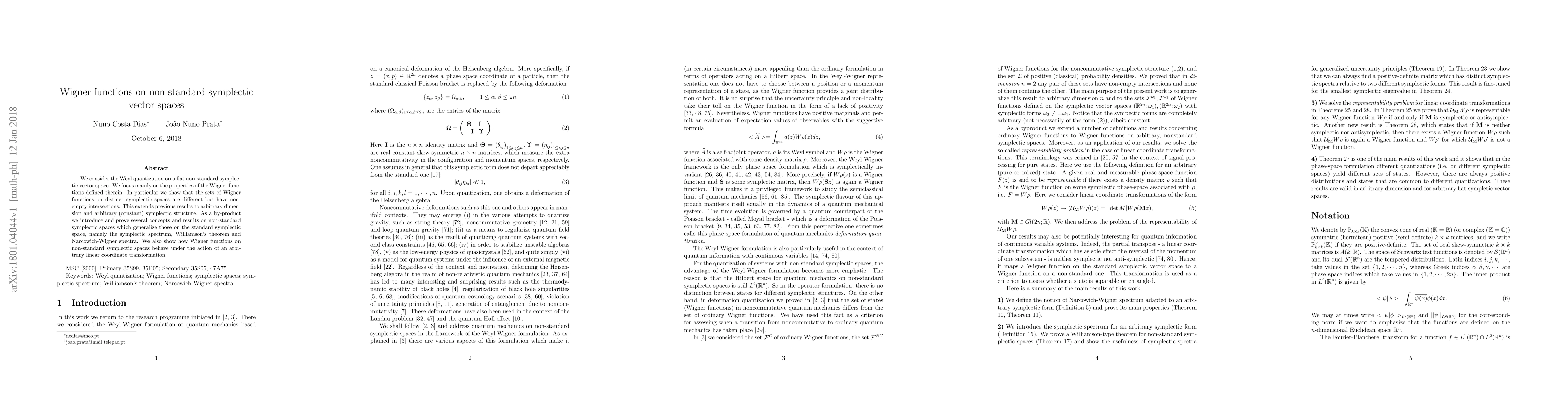 This paper explores Weyl quantization on non-standard symplectic vector spaces, demonstrating that Wigner functions on different symplectic spaces, while distinct, intersect non-emptily. It extends previous results to general dimensions and constant symplectic structures, introducing and proving concepts like the symplectic spectrum and Narcowich-Wigner spectra.
