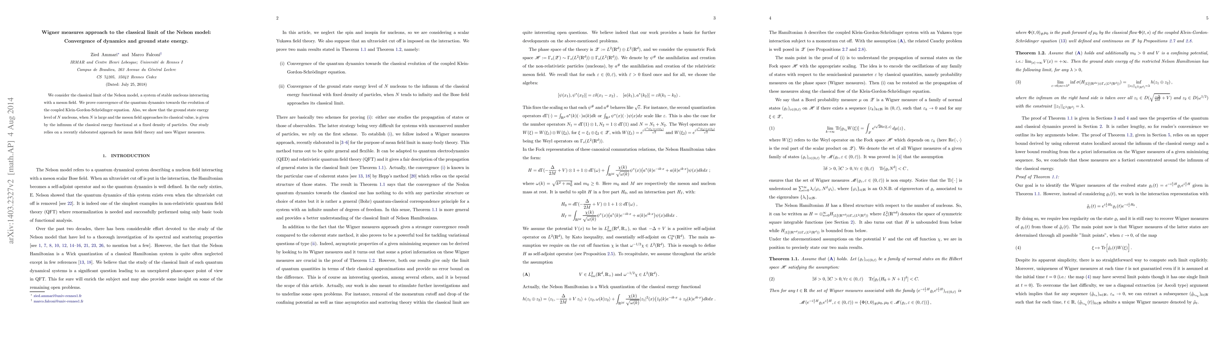 This research proves that the quantum dynamics of the Nelson model, describing nucleons and mesons, converge to the Klein-Gordon-Schrödinger equation's evolution. It also establishes that the ground state energy of N nucleons, as N grows large and meson field classicalizes, matches the minimum of a classical energy functional with constant particle density. The study employs Wigner measures and a recent mean-field theory approach.