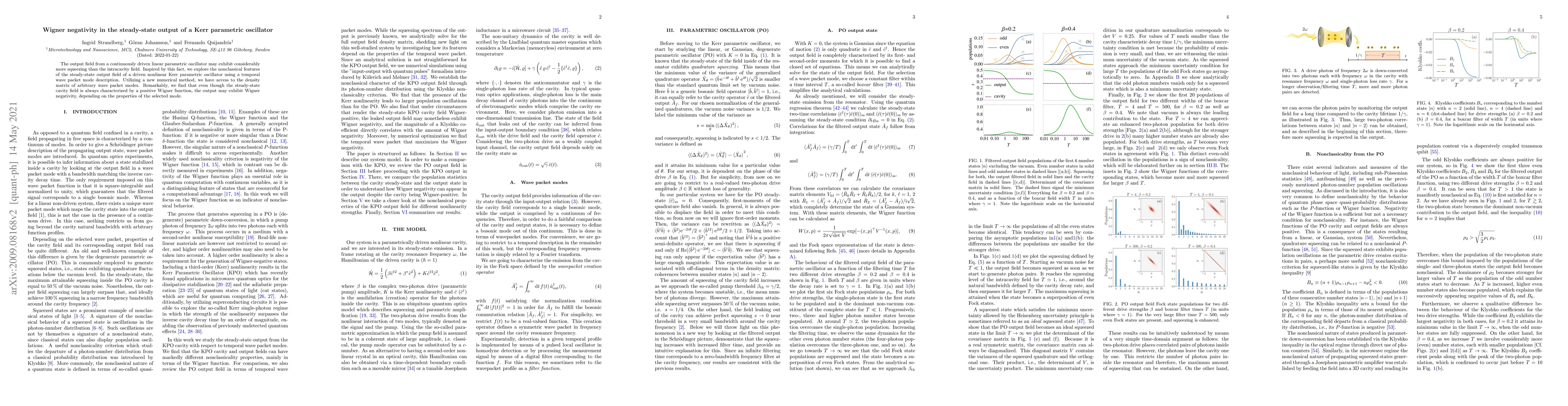 This paper explores the nonclassical features of the output field from a driven nonlinear Kerr parametric oscillator, revealing that while the cavity field has a positive Wigner function, the output field can exhibit Wigner negativity, depending on the chosen wave packet mode. This is achieved using a new numerical method to access the density matrix of arbitrary wave packet modes.