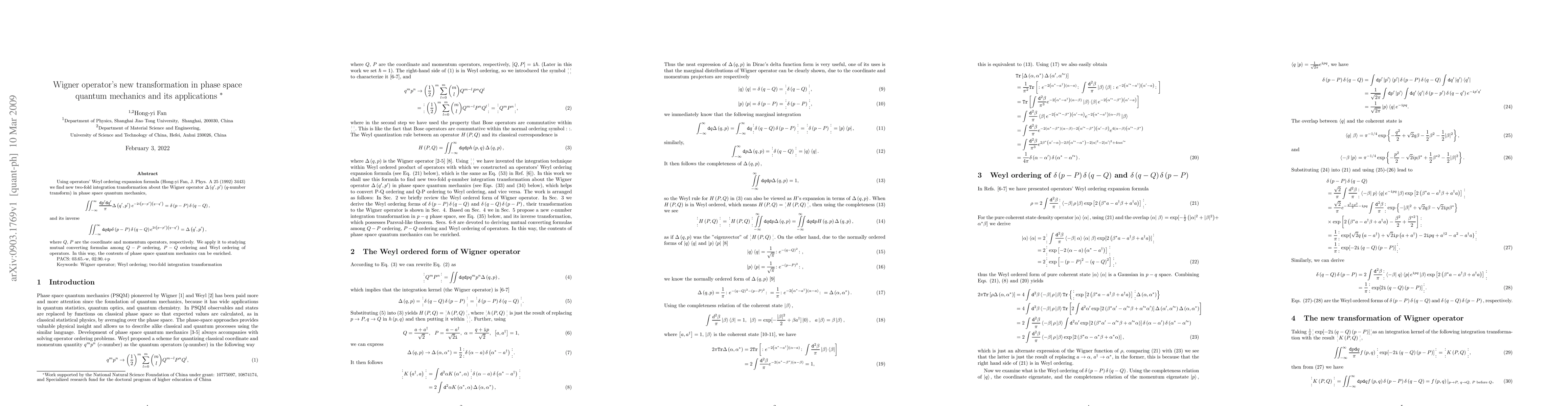 Using operators' Weyl ordering expansion formula (Hong-yi Fan,\emph{\}J. Phys. A 25 (1992) 3443) we find new two-fold integration transformation about the Wigner operator $\Delta(q',p')$ ($q$-number transform) in phase space quantum mechanics, \[ \iint_{-\infty}^\infty dp' dq'/\pi \Delta (q',p') e^{-2i(p-p') (q-q')} =\delta (p-P) \delta (q-Q), \] and its inverse \[\iint_{-\infty}^\infty dq dp \delta (p-P) \delta (q-Q) e^{2i(p-p') (q-q')}=\Delta (q',p'), \] where $Q,$ $P$ are the coordinate and momentum operators, respectively. We apply it to studying mutual converting formulas among $Q-P$ ordering, $P-Q$ ordering and Weyl ordering of operators. In this way, the contents of phase space quantum mechanics can be enriched.