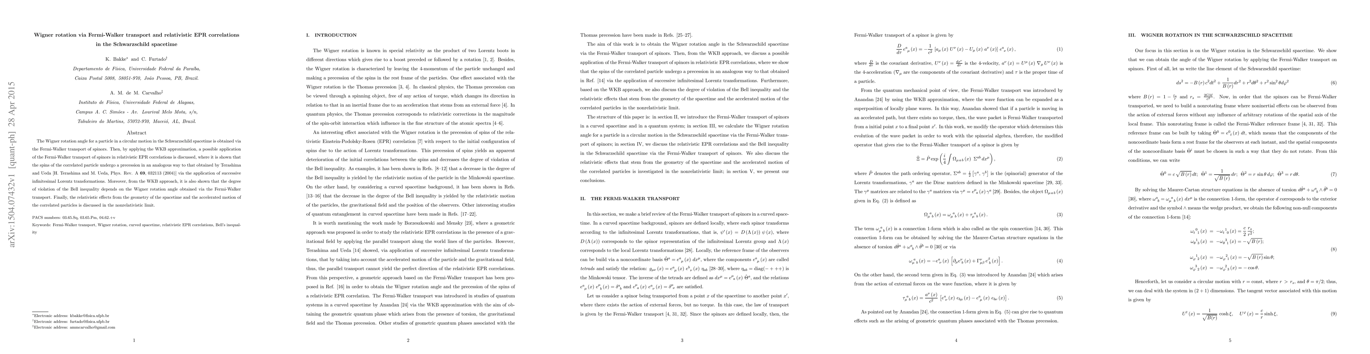 This paper investigates the Wigner rotation angle for a particle in circular motion in Schwarzschild spacetime using Fermi-Walker transport of spinors. It explores the application of this transport method to relativistic EPR correlations, showing that the spins precess similarly to results obtained via infinitesimal Lorentz transformations, and discusses how the degree of Bell inequality violation depends on the obtained Wigner rotation angle.