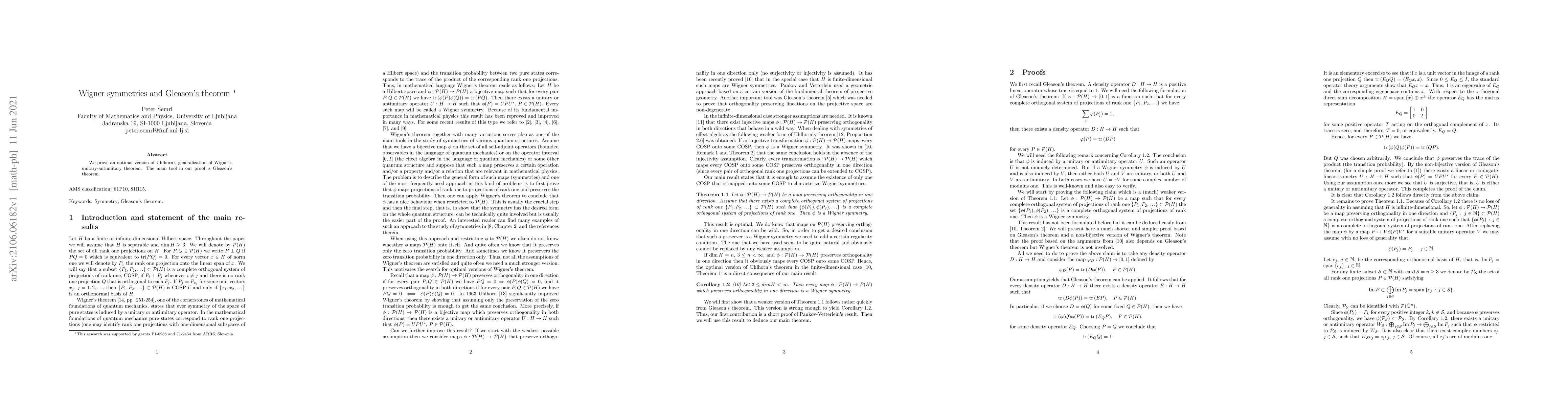 Summary: This paper proves an optimal version of Wigner's unitary-antiunitary theorem using Gleason's theorem as the primary tool, establishing a significant advancement in the understanding of symmetries in quantum mechanics.