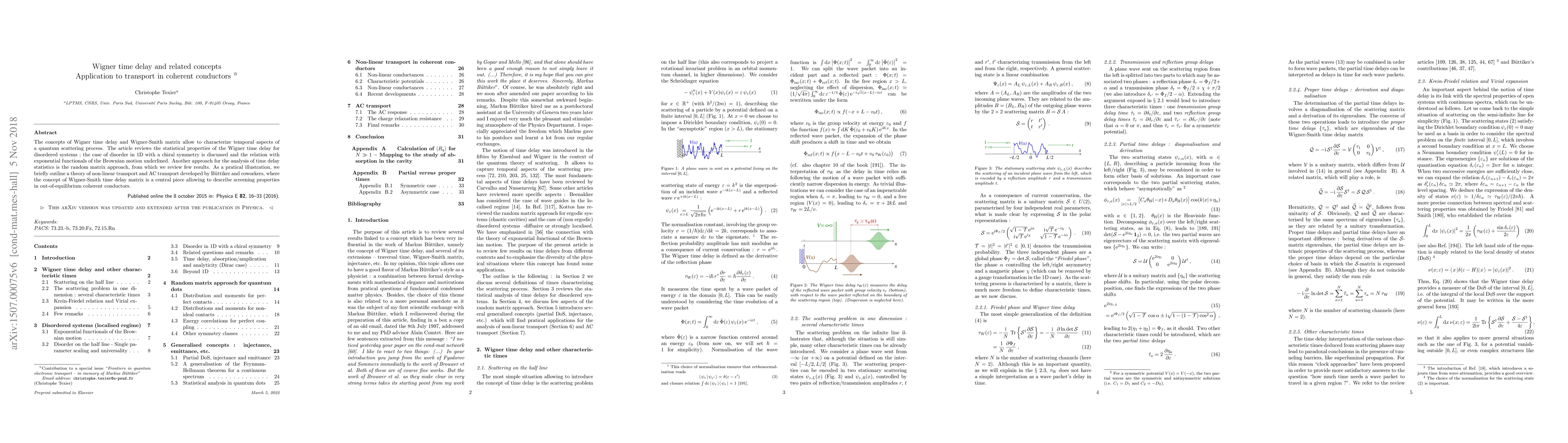 This paper reviews the Wigner time delay and its statistical properties in disordered quantum systems, emphasizing the role of chiral symmetry in 1D. It also discusses the random matrix approach to time delay statistics and applies these concepts to nonlinear and AC transport in coherent conductors, highlighting the significance of the Wigner-Smith time delay matrix.