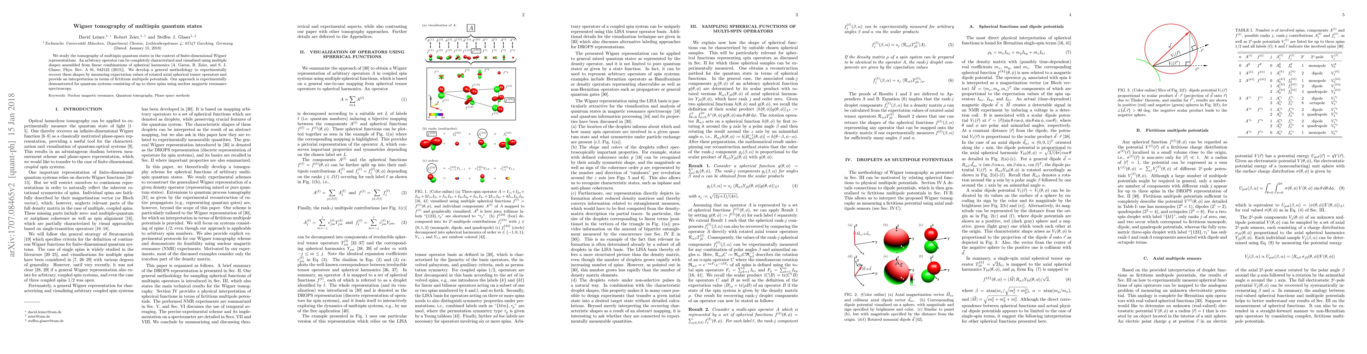 We study the tomography of multispin quantum states in the context of finite-dimensional Wigner representations. An arbitrary operator can be completely characterized and visualized using multiple shapes assembled from linear combinations of spherical harmonics [A. Garon, R. Zeier, and S. J. Glaser, Phys. Rev. A 91, 042122 (2015)]. We develop a general methodology to experimentally recover these shapes by measuring expectation values of rotated axial spherical tensor operators and provide an interpretation in terms of fictitious multipole potentials. Our approach is experimentally demonstrated for quantum systems consisting of up to three spins using nuclear magnetic resonance spectroscopy.