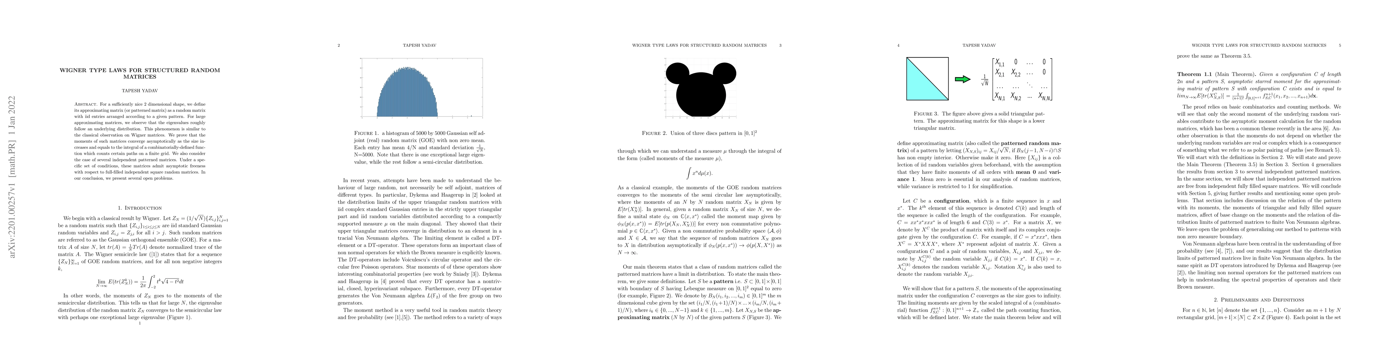 For a sufficiently nice 2 dimensional shape, we define its approximating matrix (or patterned matrix) as a random matrix with iid entries arranged according to a given pattern. For large approximating matrices, we observe that the eigenvalues roughly follow an underlying distribution. This phenomenon is similar to the classical observation on Wigner matrices. We prove that the moments of such matrices converge asymptotically as the size increases and equals to the integral of a combinatorially-defined function which counts certain paths on a finite grid. We also consider the case of several independent patterned matrices. Under a specific set of conditions, these matrices admit asymptotic freeness with respect to full-filled independent square random matrices. In our conclusion, we present several open problems.